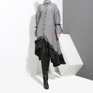【送料無料】 袖コンシャス 長袖ワンピース フリル リボン ワイドシルエット バルーン袖 ガーリー お洒落 ミディ丈 ロング丈 フィシュテール 個性派 トレンド 韓国 オルチャン デイリー パーティー 女子会 二次会 お呼ばれ OP-090HM
