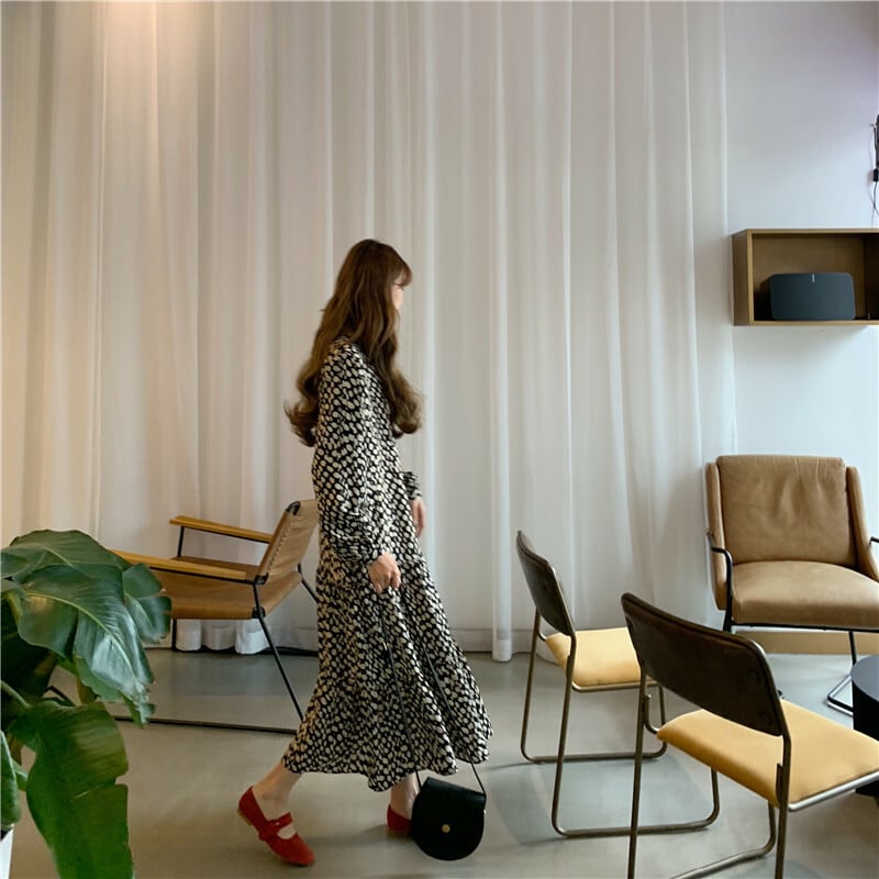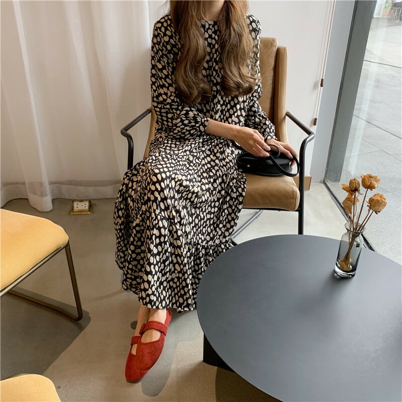 【送料無料】 水玉 ドット ロングワンピース ティアード 長袖 バルーン袖 ガーリー お洒落 ミディ丈 ロング丈 きれいめ 上品 大人可愛い トレンド 韓国 オルチャン デイリー パーティー 女子会 二次会 お呼ばれ 秋 OP-093HM