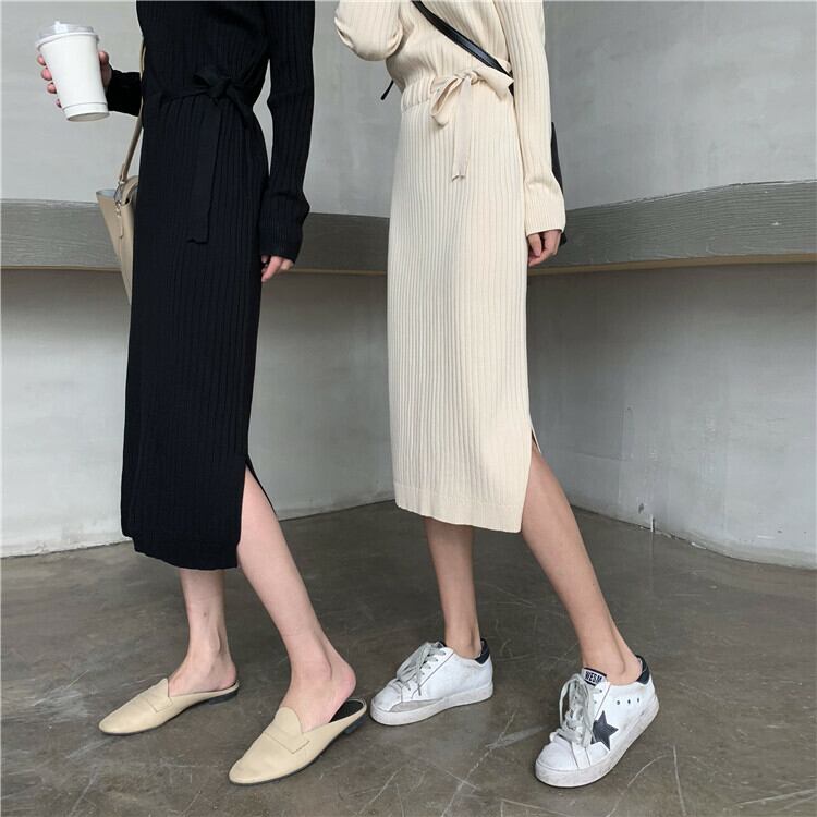 【送料無料】 リブニットワンピース 長袖 ひざ下 スリット入り ロング ウエストリボン 着痩せ効果 抜け感 お洒落 ミディ丈 きれいめ 上品 シンプル 大人可愛い 大人カジュアル トレンド 韓国 オルチャン デイリー 秋冬 OP-097HM
