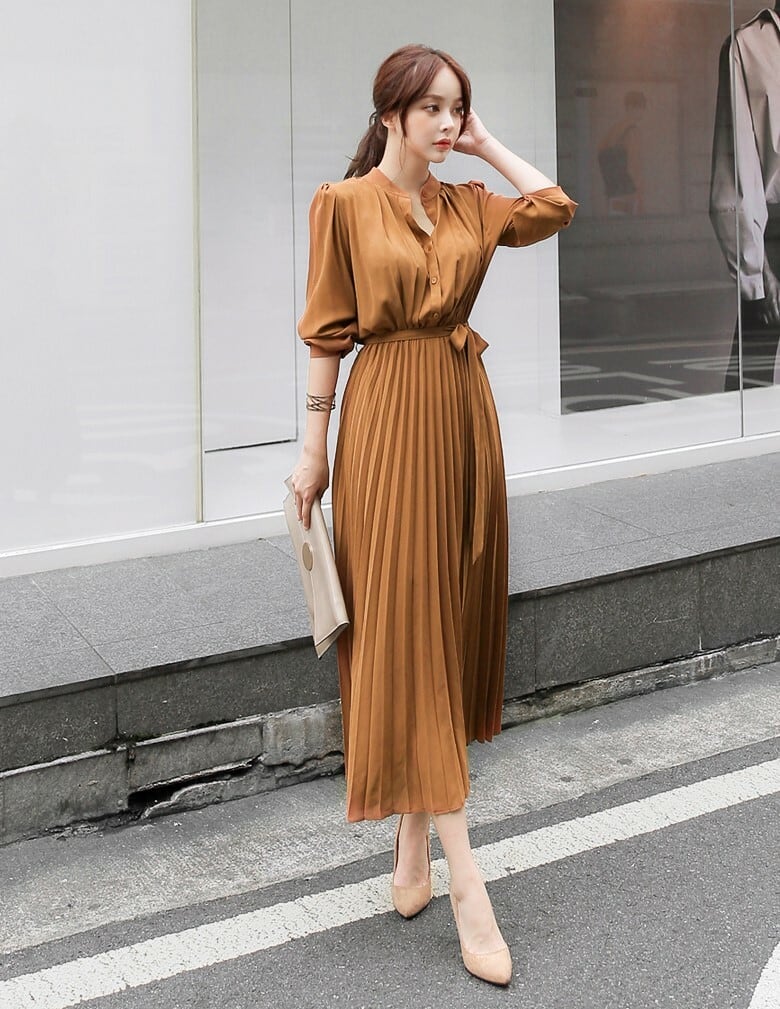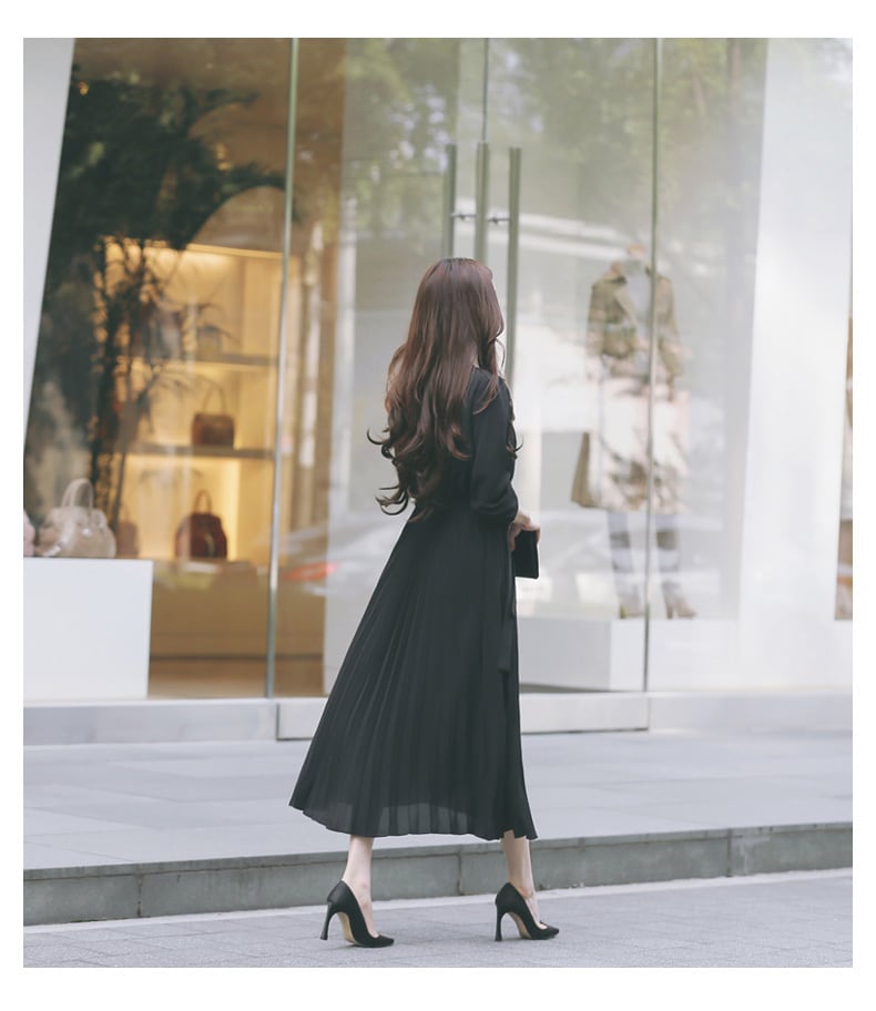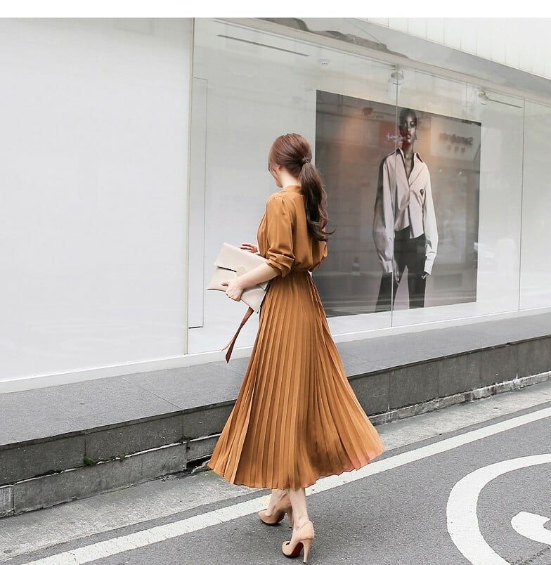 【送料無料】 ワンピース 秋 スタンドカラー プリーツ ミディ丈 リボン シフォン スレンダー 優雅 ハイウェスト トレンドカジュアル ブラック ブラウン スリム 着痩せ 足長 お洒落 トレンド 上品 きれい目 お呼ばれ 二次会 デート 女子会 通勤 OP-004KB