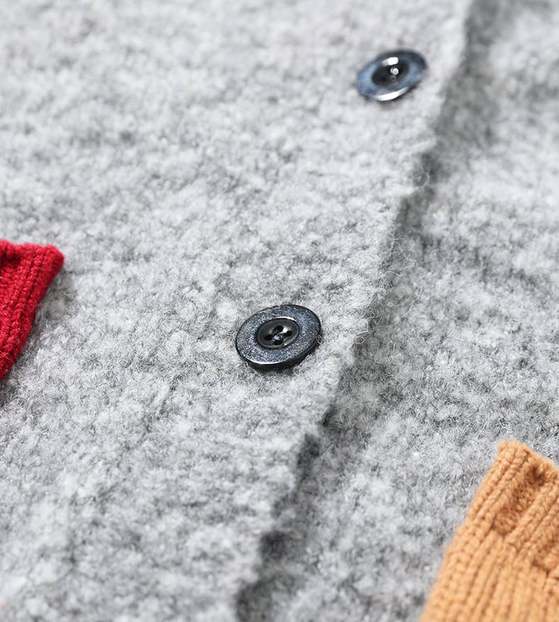 グレーカラーを基調にレッド、オレンジとホワイトの刺し色された、カラフルなユニークデザインのニットカーディガン♡ 着るだけで気持ちもアップする様な綺麗な色彩構成で毎日着たくなります☆ カレッジ風テイストも有るキュートな一着です♬