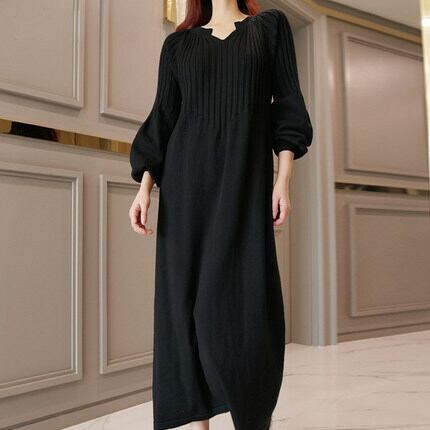 【送料無料】 ワンピ―ス ニット ワンピ ニットワンピ 長袖 Vネック 秋冬 ランタンスリーブ ミディ丈 アプリコット ブラック 着痩せ 足長 お洒落 セクシー 上品 きれい目 デート 女子会 通勤 OP-014KB