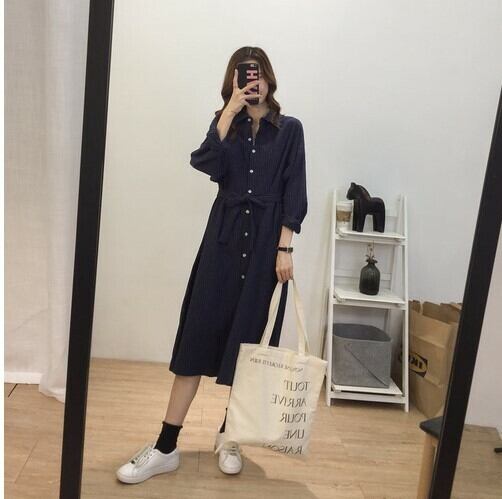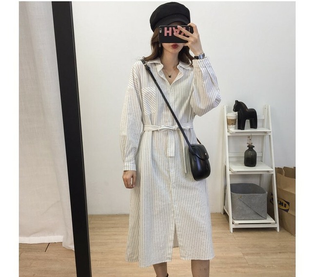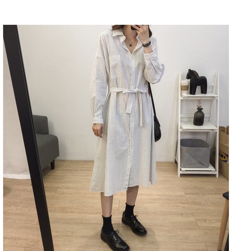【送料無料】 ワンピ―ス シャツワンピ シャツ リボン ベルト ランタンスリーブ ミディ丈 長袖 ストライプ ホワイト ベージュ ダークグレー ゆったり 足長 お洒落 可愛い デート 女子会 通勤 韓国 オルチャン OP-018KB