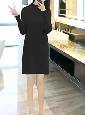 【送料無料】 ゆったり きれいめ 無地 タートルネック ニット ワンピース ミドル丈 スリーブ 全4色 OP-013MG