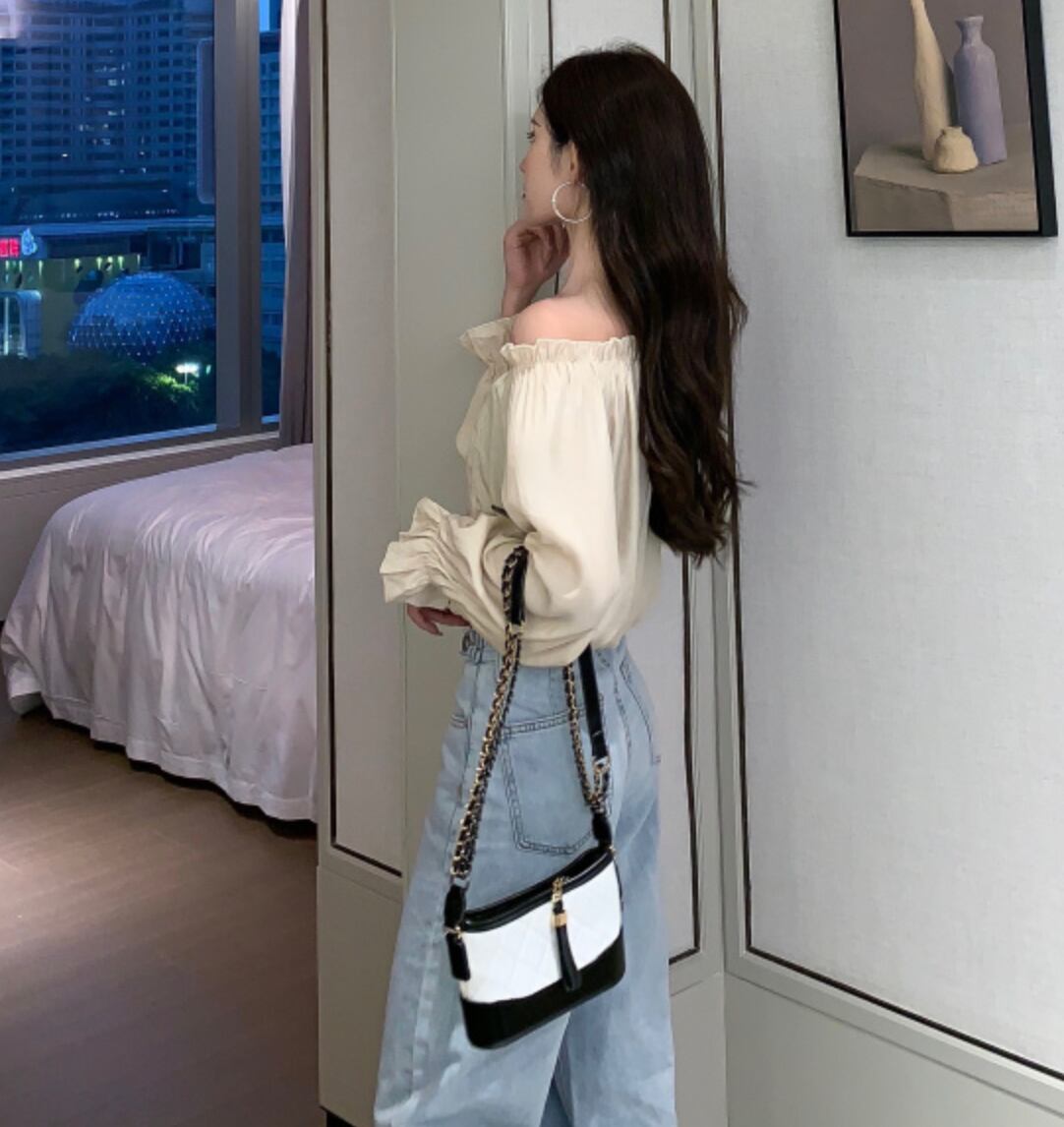 鎖骨を綺麗み見せてくれるオフショルダーのトップス。