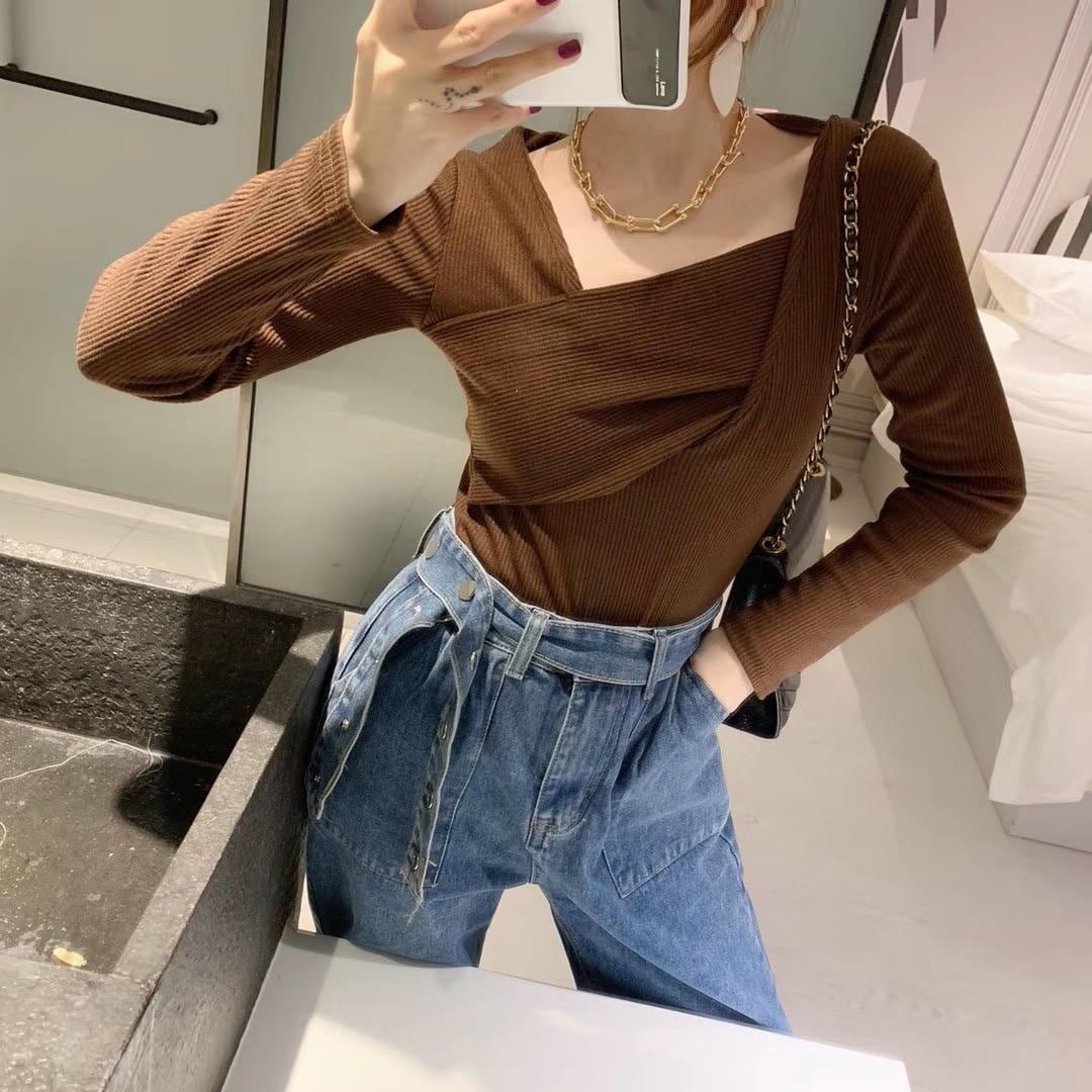 【送料無料】 トップス 秋冬 カットソー アシンメトリー クロスカラー デコルテ ブラウン グレー ホワイト ブラック スリム 着痩せ お洒落 トレンド 大人カジュアル セクシー きれい目 通勤 韓国 オルチャン TP-0025KB