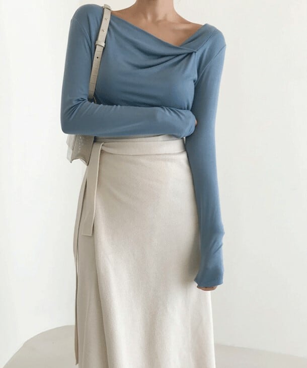 【送料無料】 トップス 秋 春 カットソー アシンメトリー クロスカラー デコルテ すっきり クール ワイドカラー 薄手 レッド ブルー ブラック スリム 着痩せ 着回し お洒落 トレンド 大人カジュアル セクシー きれい目 通勤 韓国 オルチャン TP-0026KB