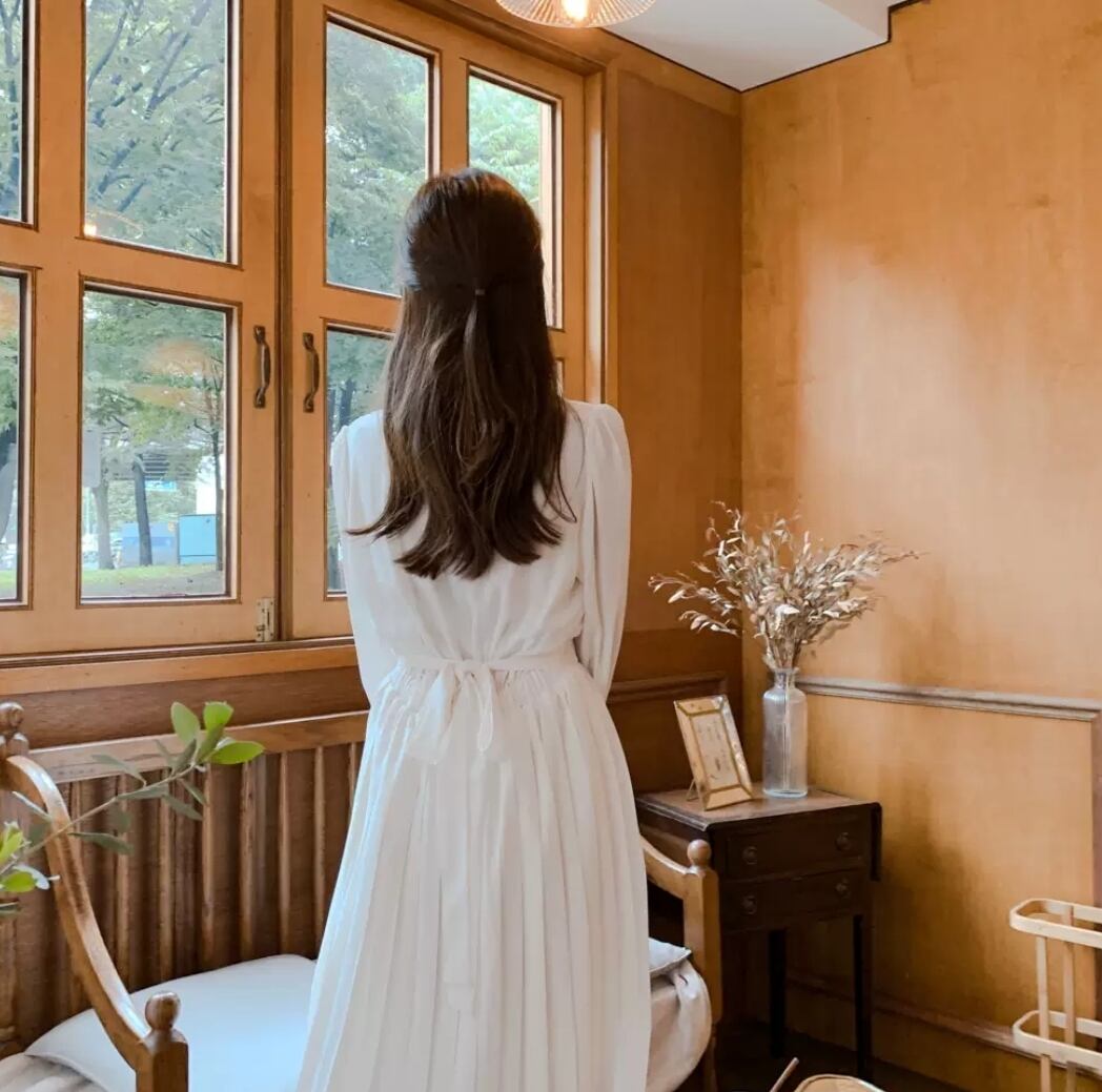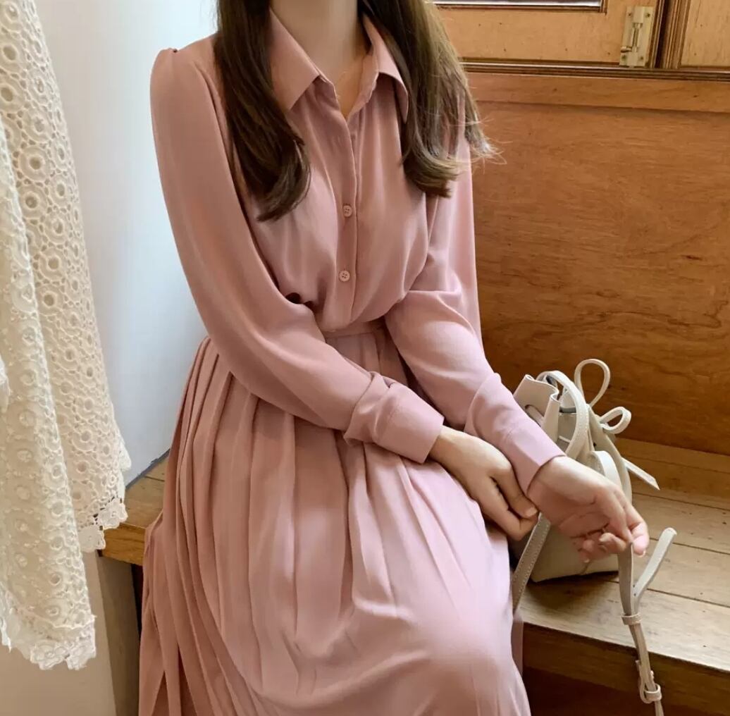 【送料無料】 大人 きれいめ 甘め レトロ シフォン風 無地 シンプル プリーツ丈 ロングワンピース ハイウエスト OP-020MG
