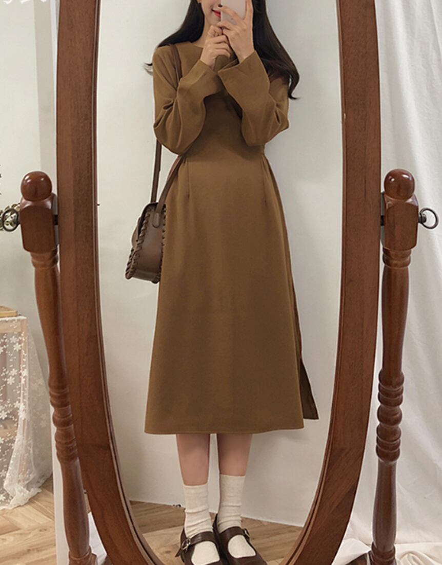 【送料無料】 ラウンドネック ワンピース デート サイドスリット ウエストリボン お呼ばれ お出かけ シンプル 無地 キャメル ブラック 春 秋 OP-014MM
