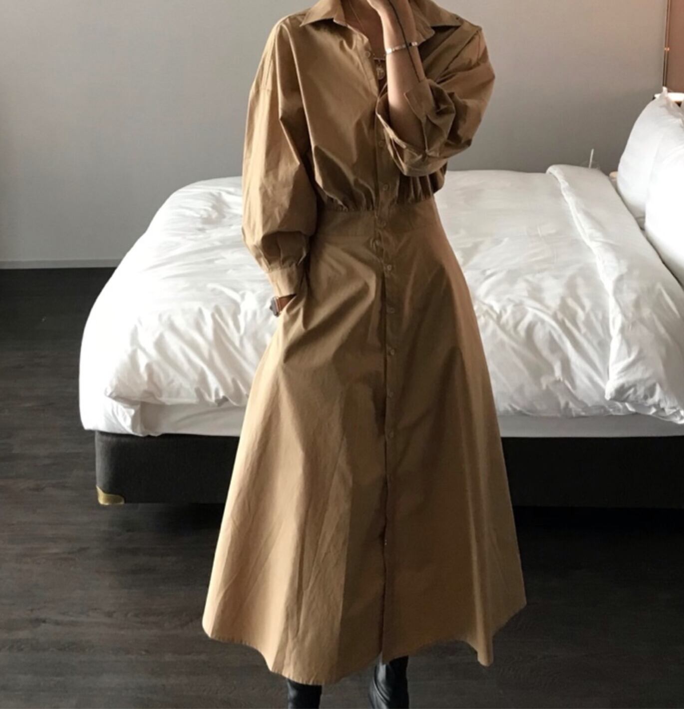 【送料無料】 レトロな雰囲気 パフスリーブ ロング シャツワンピ きれいめ 通勤 お仕事 スリムウエスト シック OP-019MM