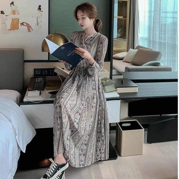 【送料無料】 レトロなワンピース フレアスカート ギャザー ロング カーキ ロングワンピース ロング丈 レトロ きれいめ エレガント 柄ワンピース 体系カバー マタニティ 長袖ワンピース 長袖 着痩せ フェニミン ランチ ママコーデ OP-021KJ