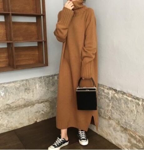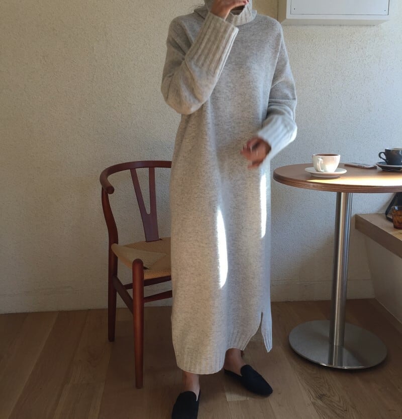 ハイネックで暖かいロング丈のニット。ワンピースの下にレギンスやデニムを合わせるのがトレンドの着方です♪そのままでも可愛い◎ゆるっと着れるのでマタニティコーデにも。