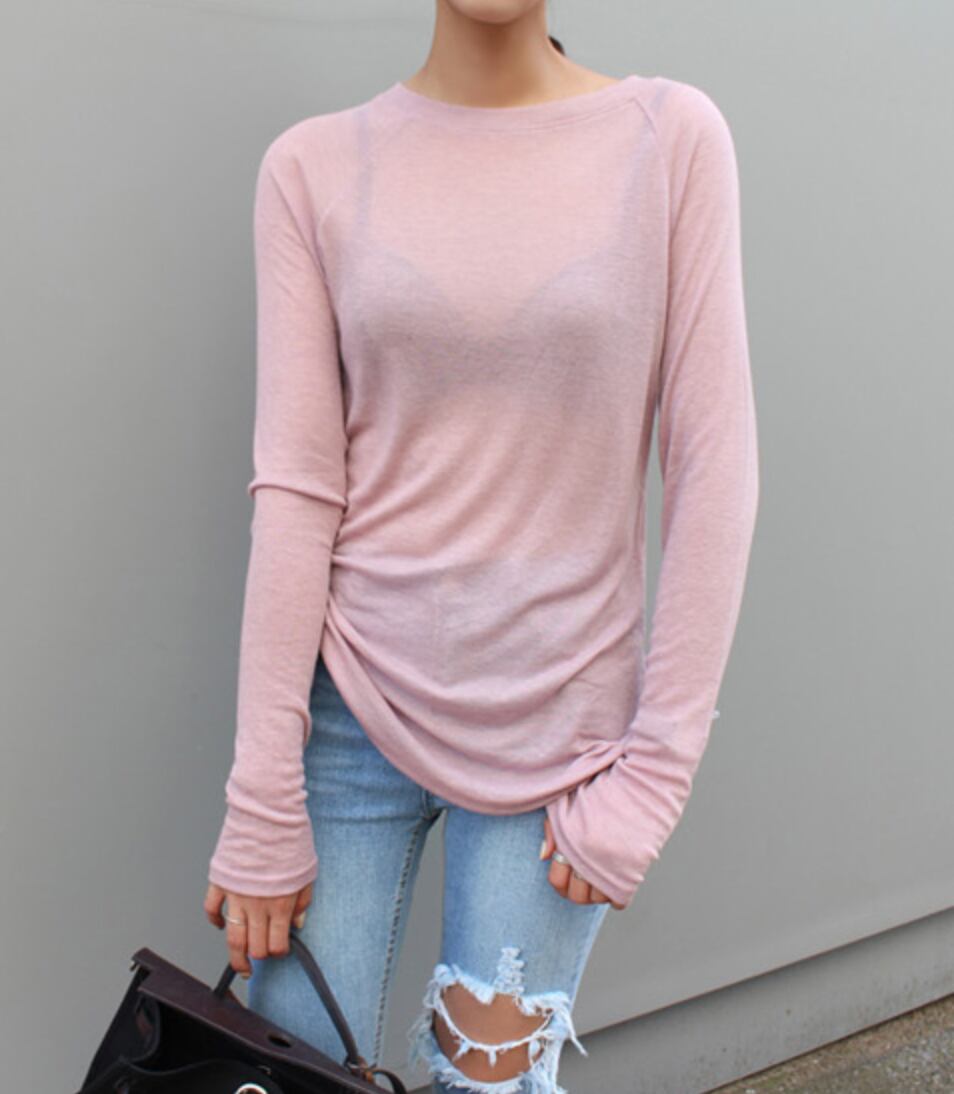 【送料無料】 シースルー ボディフィット スリム トップス シンプル ぴったり カジュアル ラウンドネック 重ね着 カットソー 長袖 ブラック ホワイト ライトブルー ピンク ネイビー TP-027MM