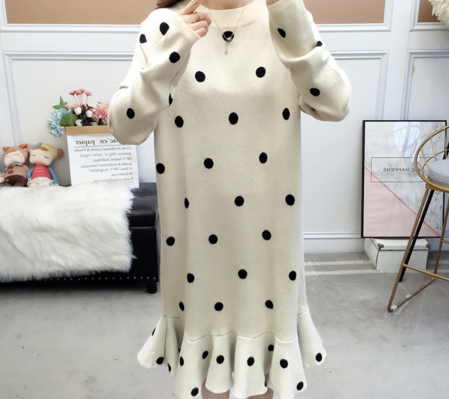 【送料無料】 裾フリル ニットワンピース ふんわり 長袖 ドット柄 ロングワンピース ゆるかわ 愛され モテワンピ 褒められ ロング丈 秋冬 ニット 水色 黒 ベージュ 黄緑 ピンクOP-032MM