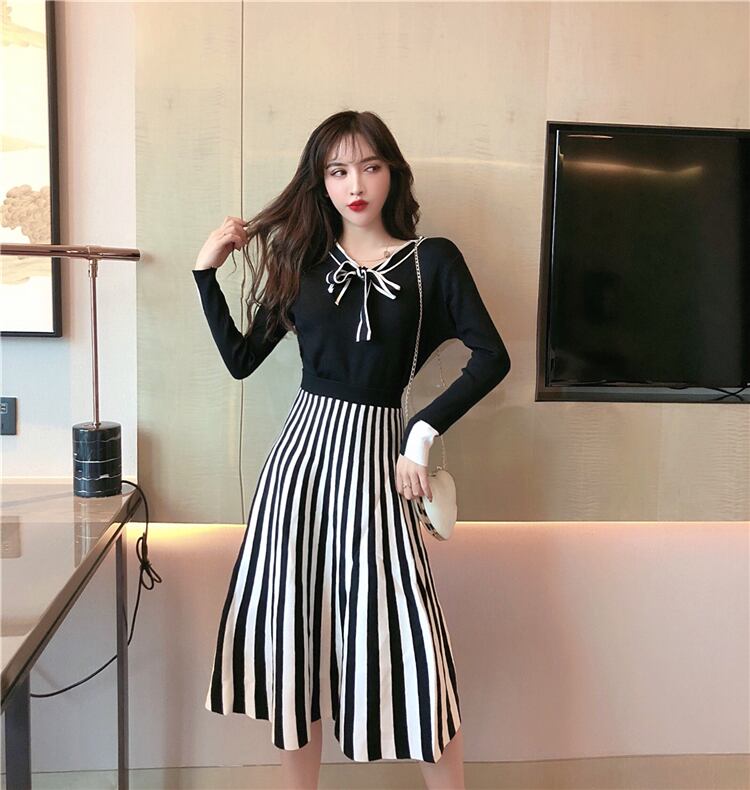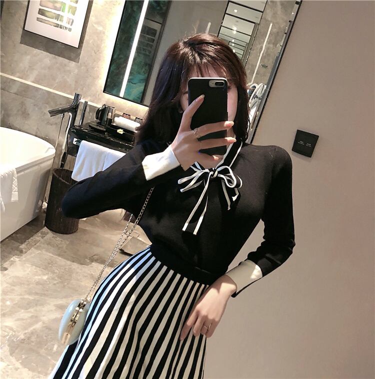 【送料無料】 セットアップ 秋 プリーツ ニット ひざ下丈 ストライプ ミディ丈 ガーリー セーター リボンタイ バイカラー ブラック ベージュ スリム 着痩せ 足長 お洒落 トレンド 可愛い 上品 きれい目 お呼ばれ 二次会 デート 女子会 通勤 韓国 オルチャン ST-004KB