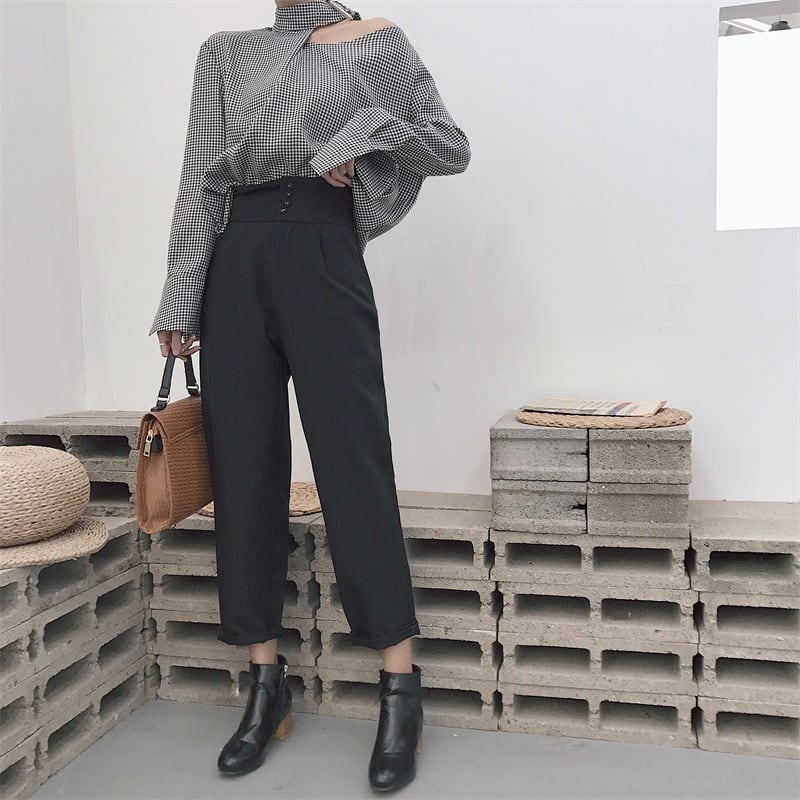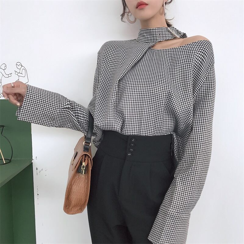【送料無料】 ワンショルダー アシンメトリー ワンショル トップス チェック柄 チェック ボリューム袖 秋冬 レトロ 大人 かわいい デート きれいめ エレガント TP-052KJ