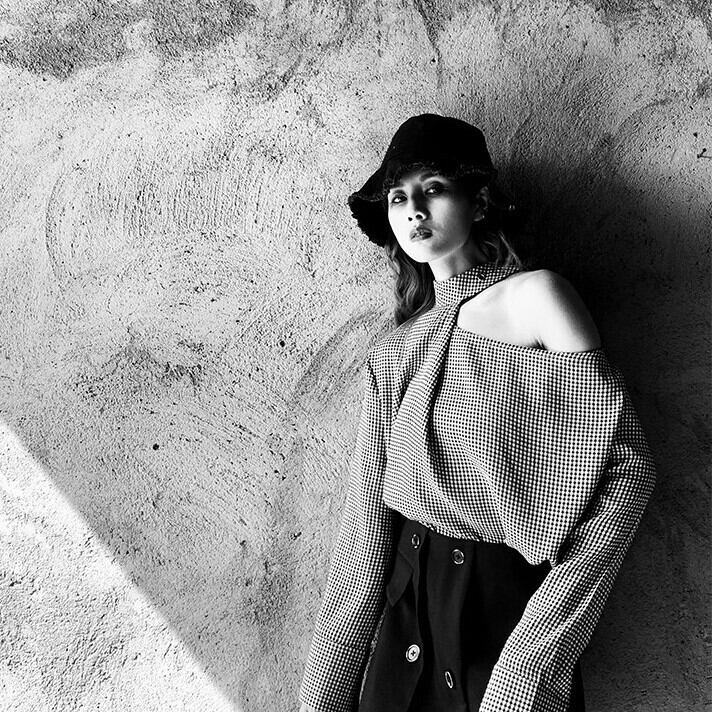 ワンショルダーと襟の組み合わせがオシャレな千鳥柄の長袖シャツ。合わせるボトムスによってきれいめにもカジュアルにもなるアイテムです。