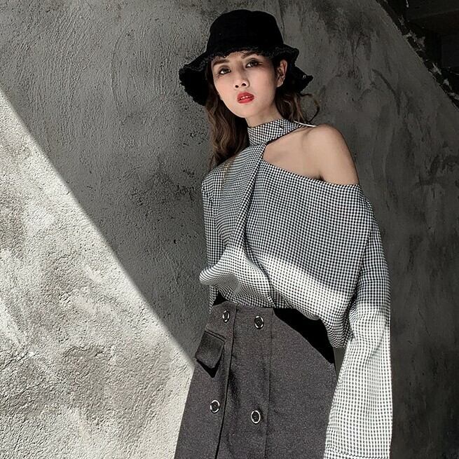 【送料無料】 ワンショルダー ワンショル ブラウス トップス 千鳥柄 チェック チェック柄 秋冬 大人 きれいめ 韓国 襟 襟シャツ オフショルダー TP-054KJ