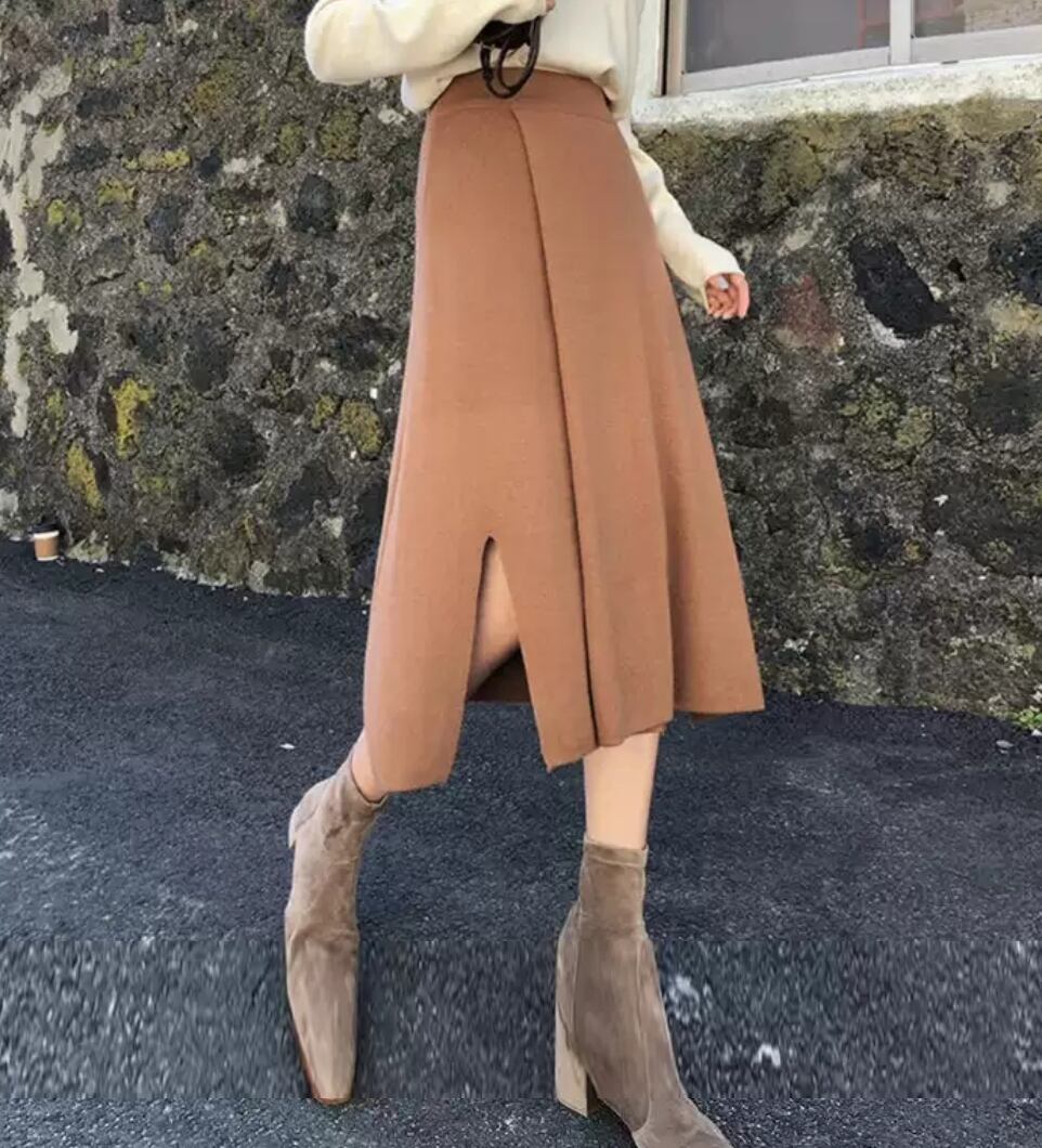 【送料無料】 無地 カジュアル ハイウエスト スカート ミドル丈 フレアスカート 秋冬 ニット 温暖 SK-007MG