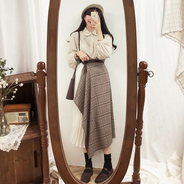 【送料無料】 プリーツスカート チェック柄 チェックスカート ロング丈 ロングスカート アシンメトリー 秋冬 かわいい 韓国 ハイウエスト 体型カバー SK-060KJ