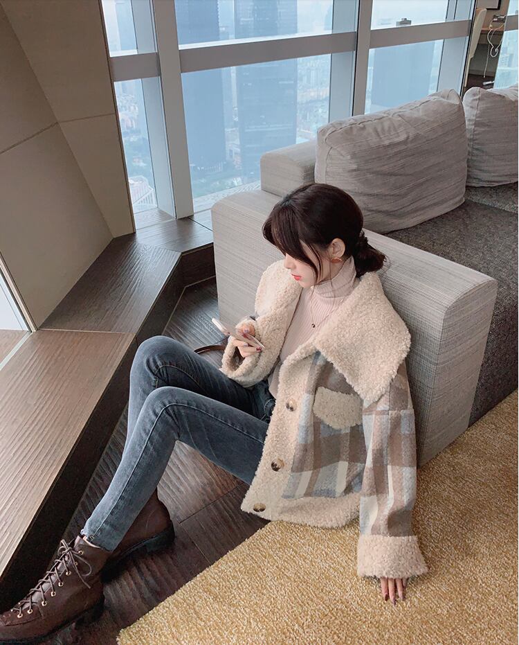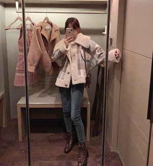 綺麗なチェック柄の襟、カフスがボアタイプのジャケットです♡ ゆったり感ある大きさでざっくり着れて、セーターの重ね着も楽々◎ パンツでもスカートでもボトムスを問わないコーデ上手☆ 大人カジュアルのセンスが光る一着です♬