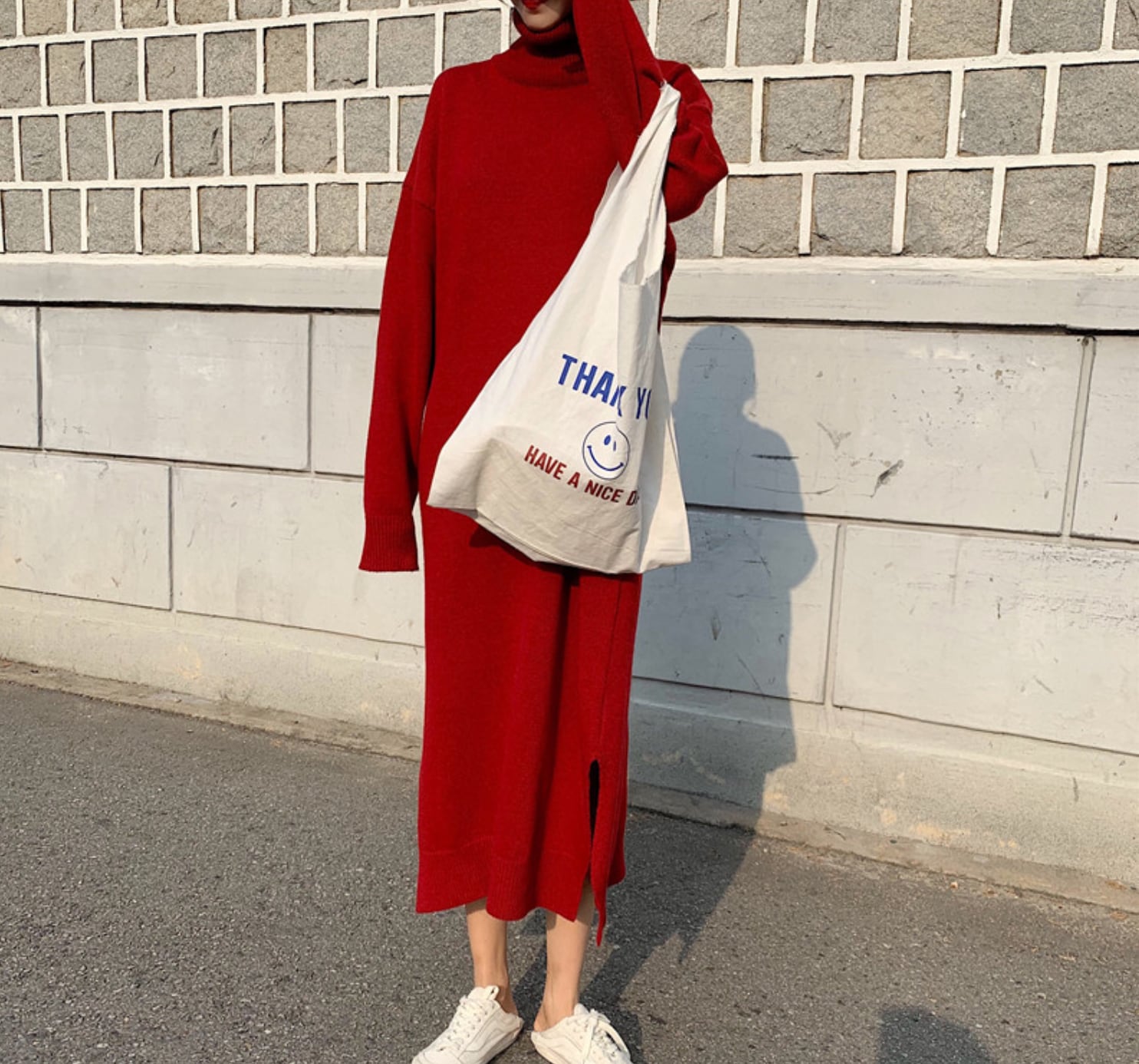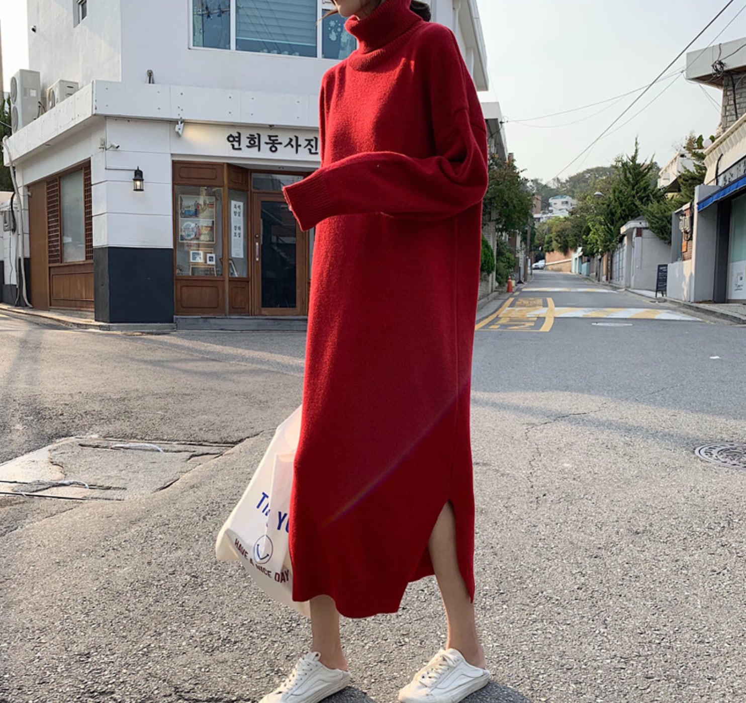 【送料無料】 大人スタイル 大きいサイズ トレンド ニットワンピース ニット ハイネック カジュアル 秋冬 あったか スリット 長袖 ロング 着痩せ効果 通勤 デート ホワイト レッド ブラック OP-046MM