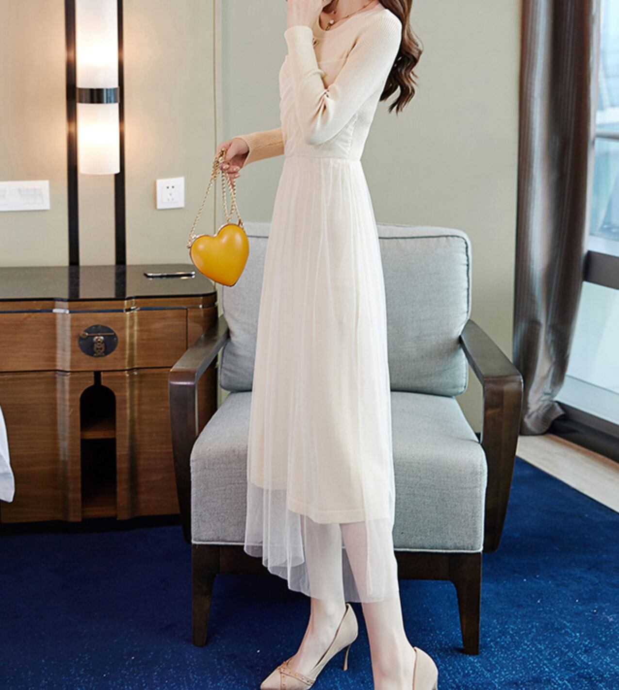 【送料無料】 上品スタイル ワンピース ロング丈 チュール ニット エレガント スタイルアップ スリムフィット OL 秋冬 長袖 着痩せ効果 通勤 デート お呼ばれ パーティー OP-050MM