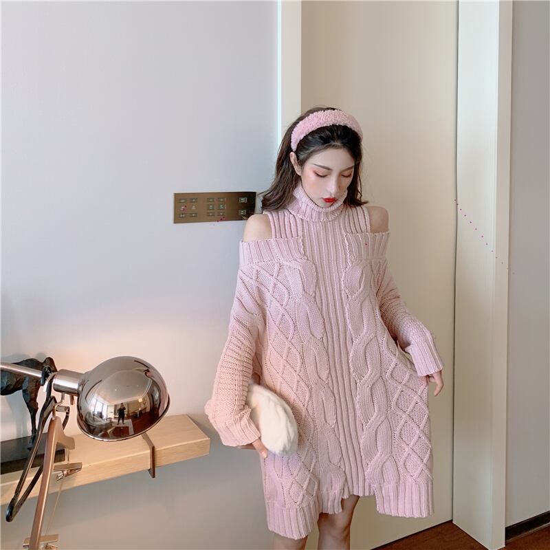 【送料無料】 ワンピース 秋冬 ニット セーター ニットワンピ オープンショルダー 長袖 ケーブルニット タートルネック ボリューム袖 袖コンシャス ホワイト ピンク ゆったり 着痩せ 足長 お洒落 トレンド 可愛い セクシー きれい目 デート 女子会 通勤 韓国 オルチャン OP-030KB