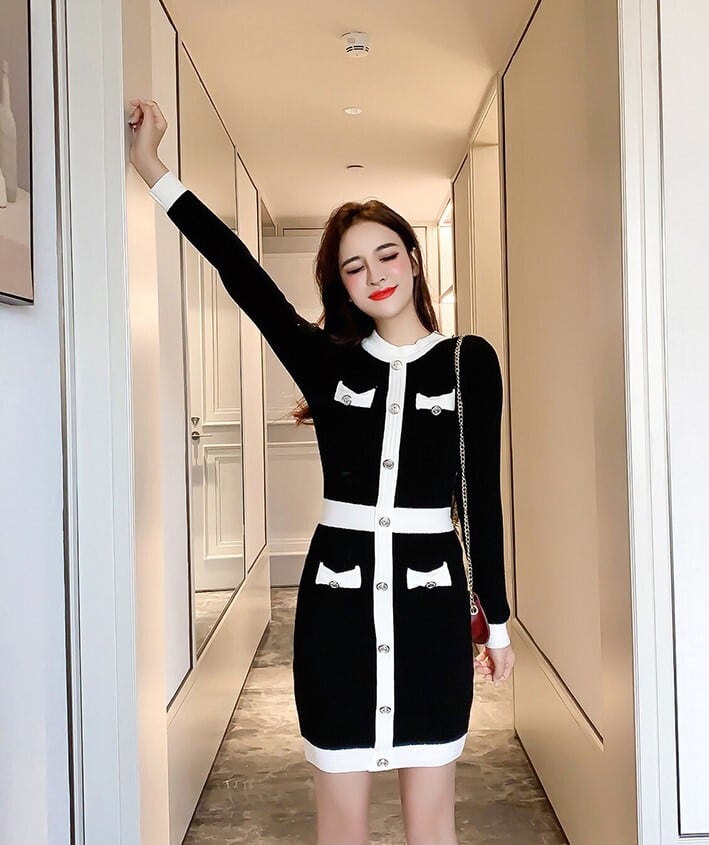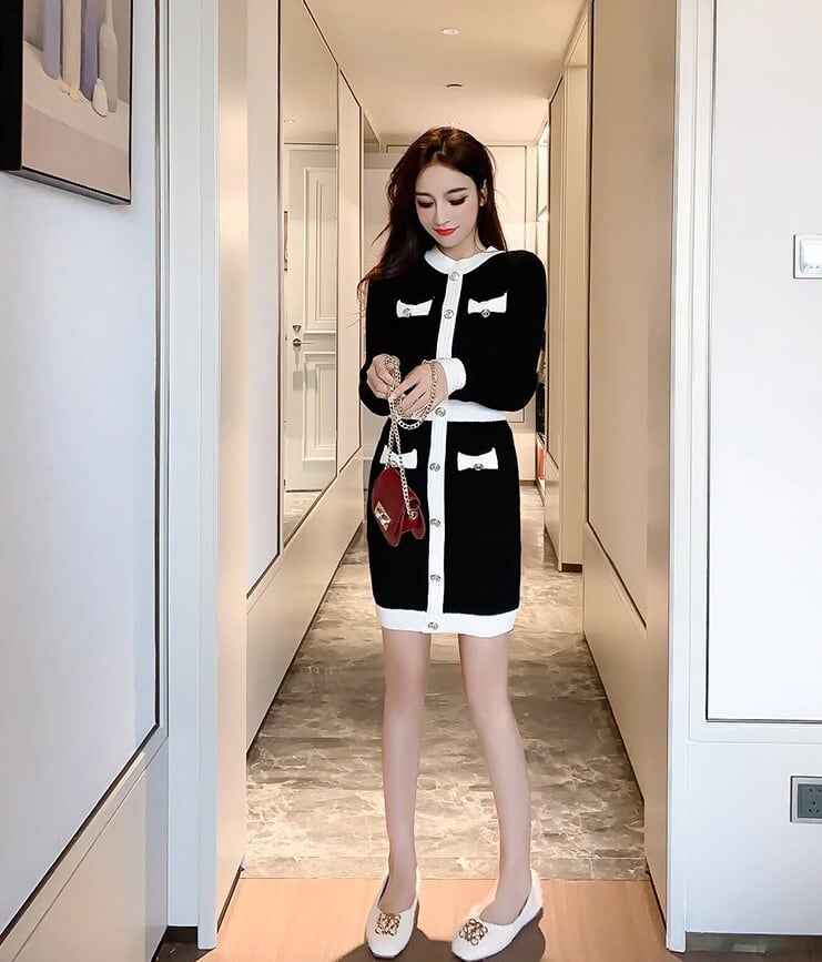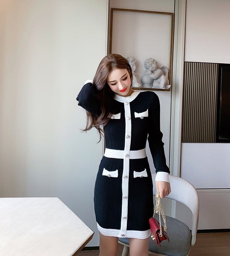 【送料無料】 ワンピース 秋 春 長袖 ニット セーター ラウンドネック バイカラー ハイウエスト ミニ丈 タイト スーツ 長袖 ブラック スリム 着痩せ 足長 お洒落 トレンド 可愛い セクシー 上品 きれい目 お呼ばれ 二次会 デート 女子会 通勤 韓国 オルチャン OP-033KB