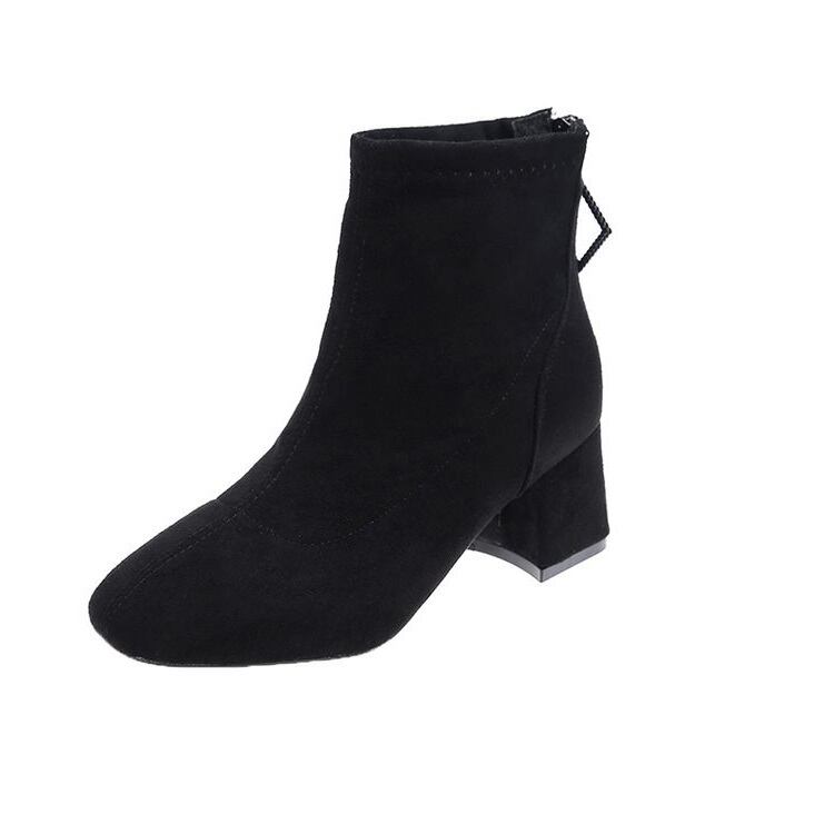 スエード調の質感が高級感漂うチャンキーヒールショートブーツです♪バックジッパーのスクエアがポイントのオシャレなデザイン♪高すぎない6cmヒールで普段使いにもGOOD♪チャンキーヒールで疲れにくいのもポイントです☆