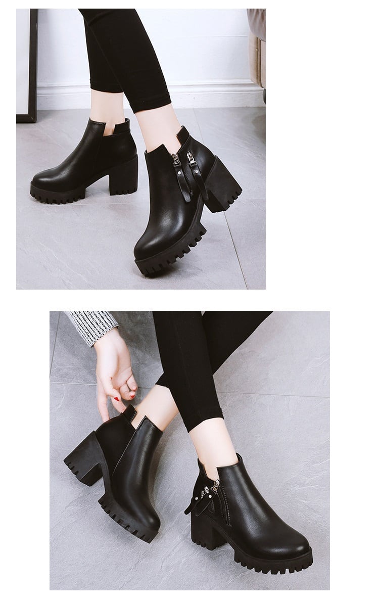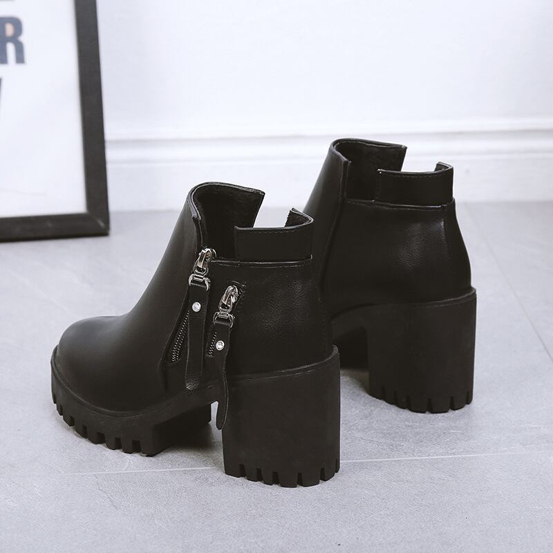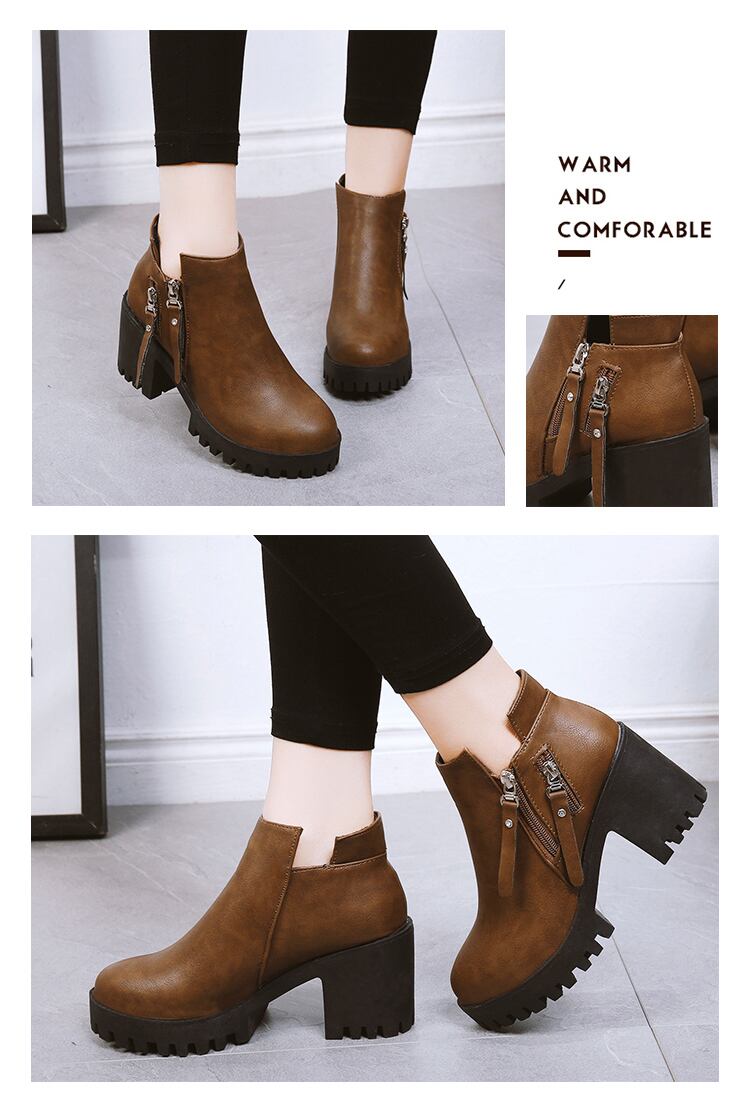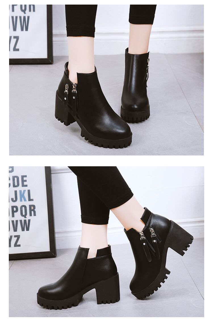ダブルジップのデザインがポイントの厚底ショートブーツです♪高すぎず低すぎない丁度よいヒール高で脚長効果も期待大♪チャンキーヒールでバランスがとりやすく疲れにくいのもポイント♪シンプルデザインなのでコーデに合わせやすく、飽きの来ない一足です☆