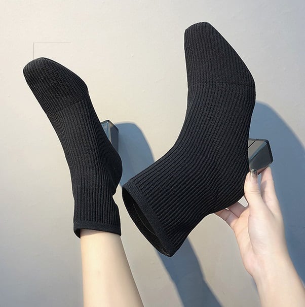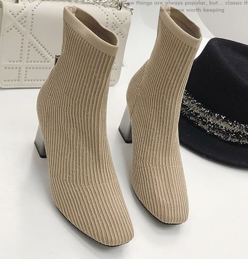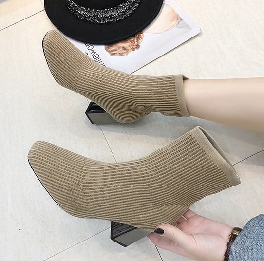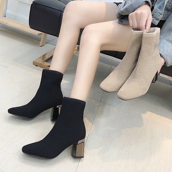 【送料無料】 2カラー ソックスブーツ リブ ミドル丈 ストレッチ チャンキーヒール 7cmヒール ショートブーツ アンクルブーツ スクエアトゥ ポインテッドトゥ らくちん 歩きやすい 脚長効果 美脚 美シルエット 厚底ブーツ 厚底ブーティー ブラック 黒 ベージュ シンプル 普段使い 通勤 通学 おしゃれ お洒落 秋 冬 FW-052HM