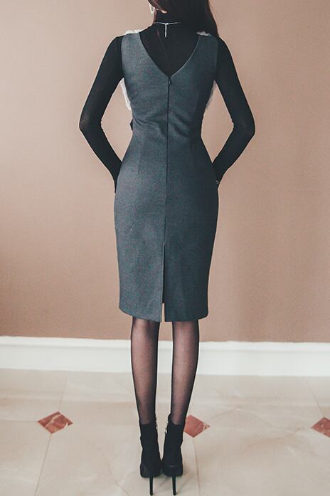 【送料無料】 ダークグレーもこもこファートップ☆ツーピース風ワンピース Vネック スリムフィット ハイエンド ドレス 袖無し ベルト付ハイウエスト ミディアム丈 タイトスカート ペンシルスカート スリムスタイル ハイクオリティー ハイセンス シティー 気品 エレガント 秋冬 オフィス フェミニン パーティー お呼ばれ 二次会 結婚式 OP-054KW