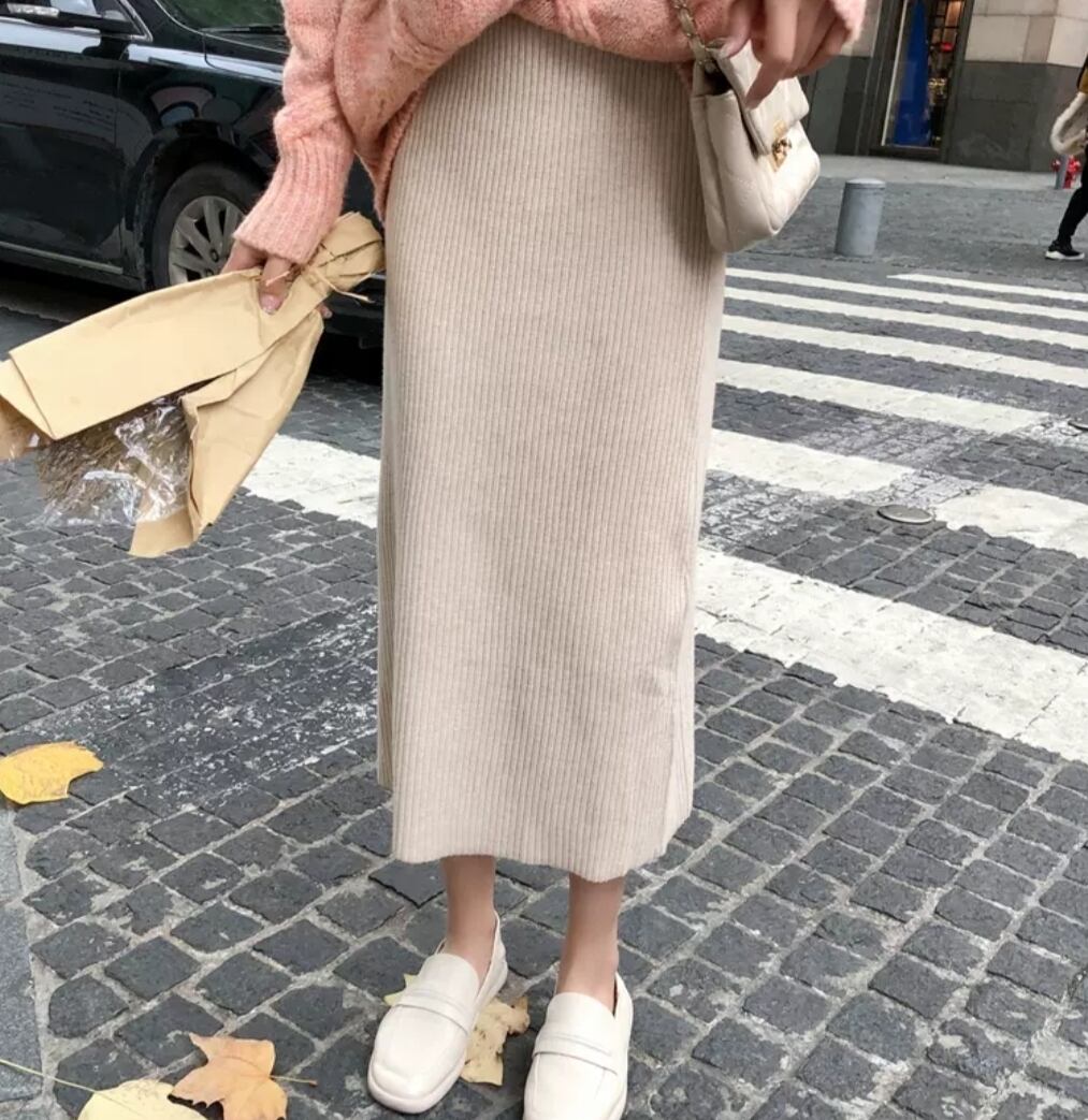 【送料無料】 全4色 無地 シンプル ざっくりニット ストレート ハイウエスト Aライン ミドル丈 カジュアル ロング スカート 秋冬春 SK-008MG
