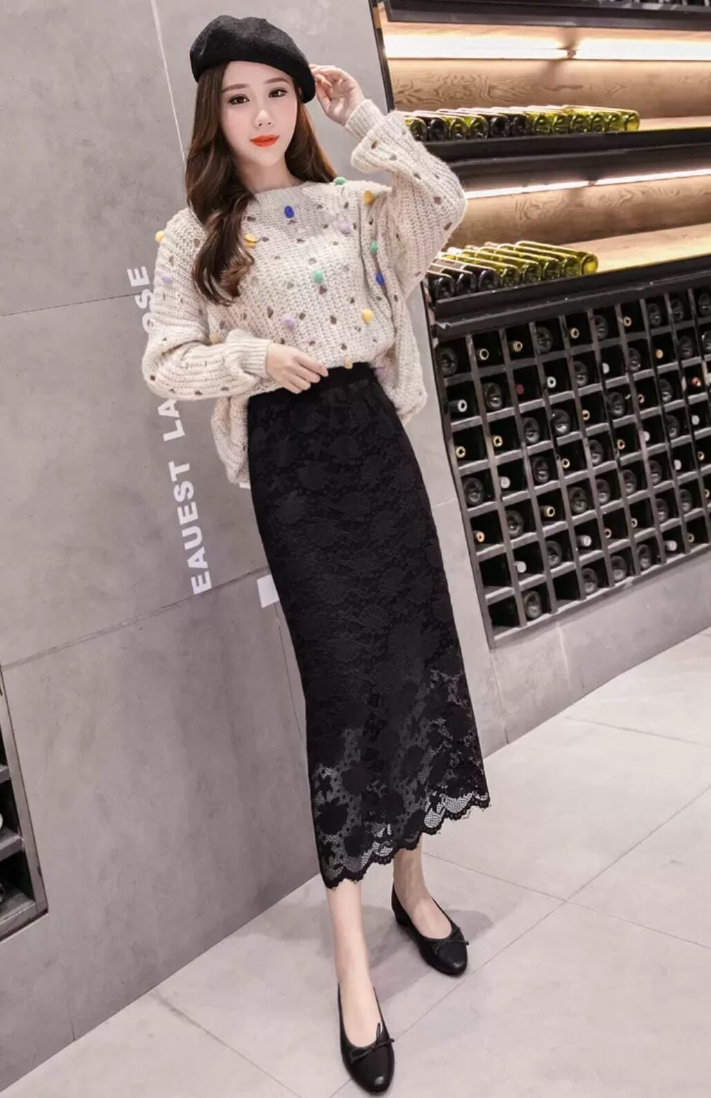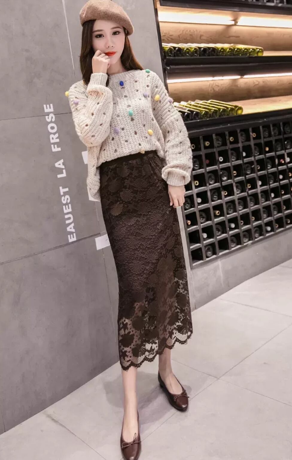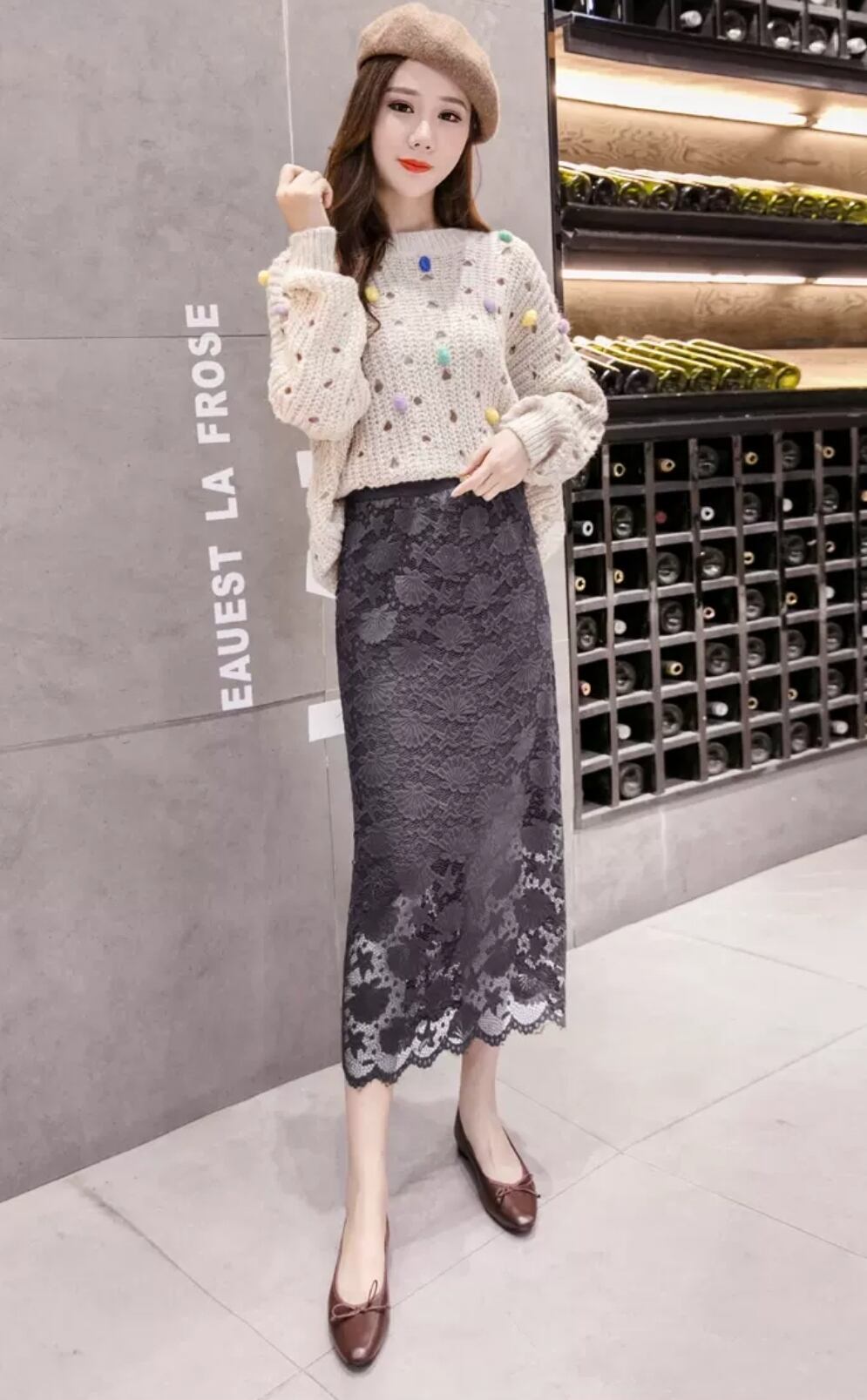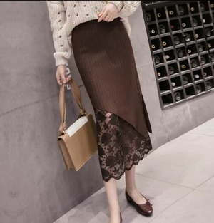 【送料無料】 全5色 2way リバーシブル ざっくりニット レース 貝殻 ハイウエスト ミディ丈 ロング タイトスカート シンプル 無地 ハイウエスト スリム 秋冬春 SK-019MG