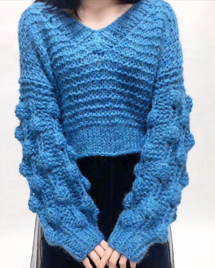 ユニークなポンポンモチーフの肩落ち袖のVネックセーター全3色です♡ ショート丈と長い袖がアンバランスでスタイリッシュ☆ オフィスからデート迄、オンオフで大活躍の一着♬ 無地だからボトムスもジャケットもコーデし易いく便利です◎