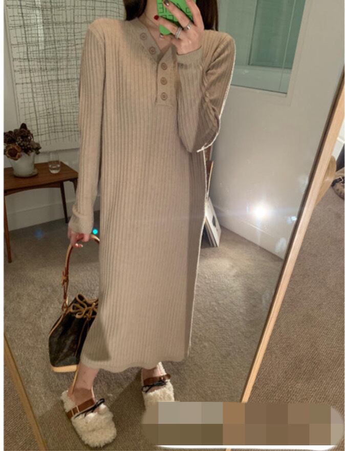 【送料無料】 ニットワンピース ニットワンピ リブニット ロングワンピース シンプル セクシー Vネック ワンカラー 秋冬 デート きれいめ 大人 カジュアル モノトーン ミルクティー ブラック OP-134KJ