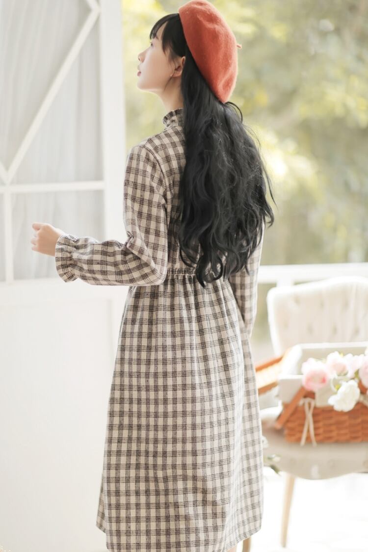 【送料無料】 チェック柄ワンピース チェック フリルネック フリルワンピース バルーン袖 上品 かわいい 女の子 韓国 ロング丈 秋冬 ワンピース デート OP-143KJ