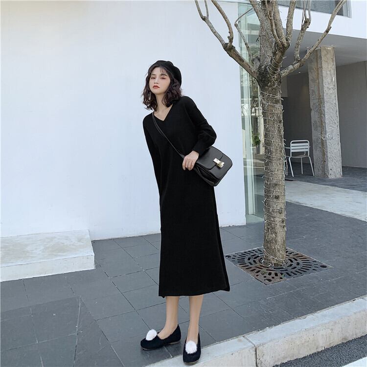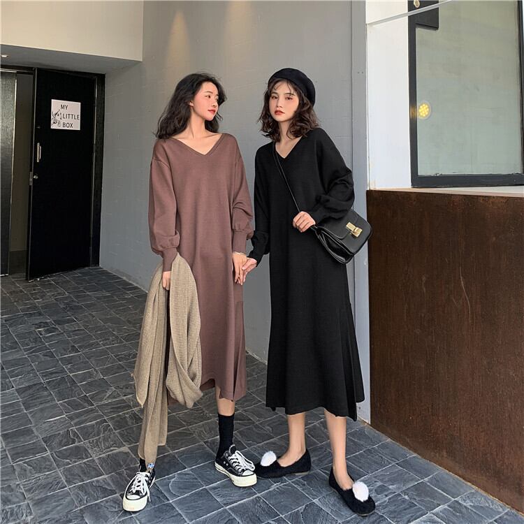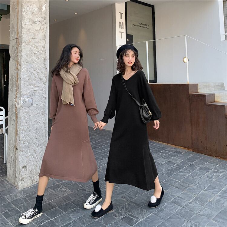 【送料無料】 ニットワンピース ニット ロングワンピース ロング丈 ニット セーター ブラウン ブラック Vネック ハイウエスト Aラインスカート 秋冬 韓国 シンプル ロングスカート デート お揃い ペアルック OP-148KJ