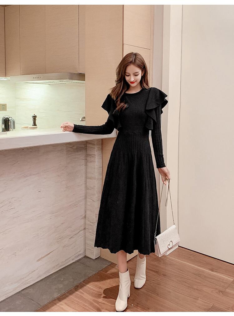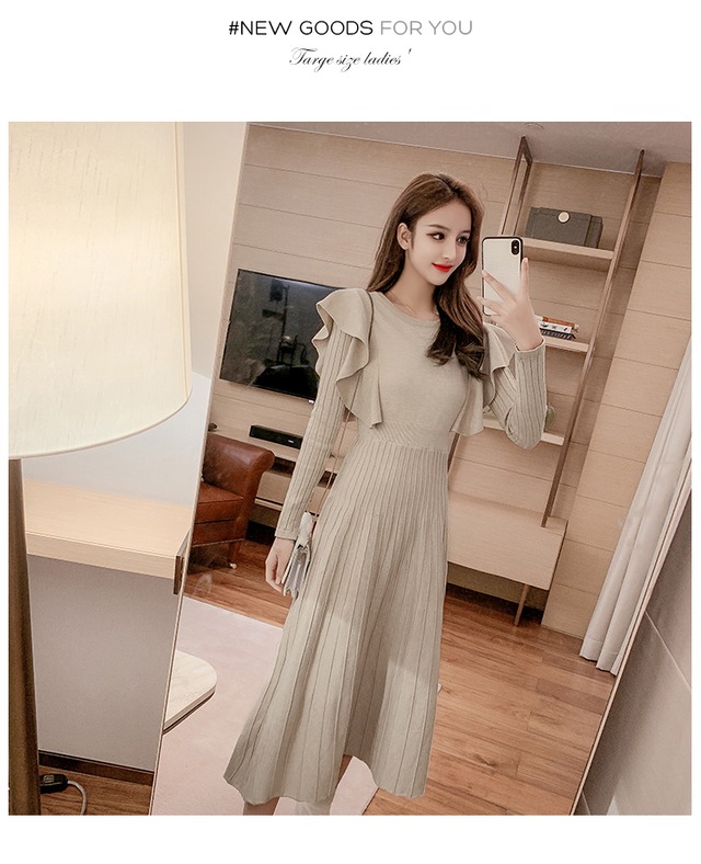 【送料無料】 春 薄手ニット ハイウエスト ワンピース Aライン お出かけ ウエストリボン フリル フェミニン ロング丈 ポリエステル 可愛い 大人っぽい 女性らしい エレガント シンプル 通勤 通学 無地 モノトーン カーキ ブラック OP-008KR