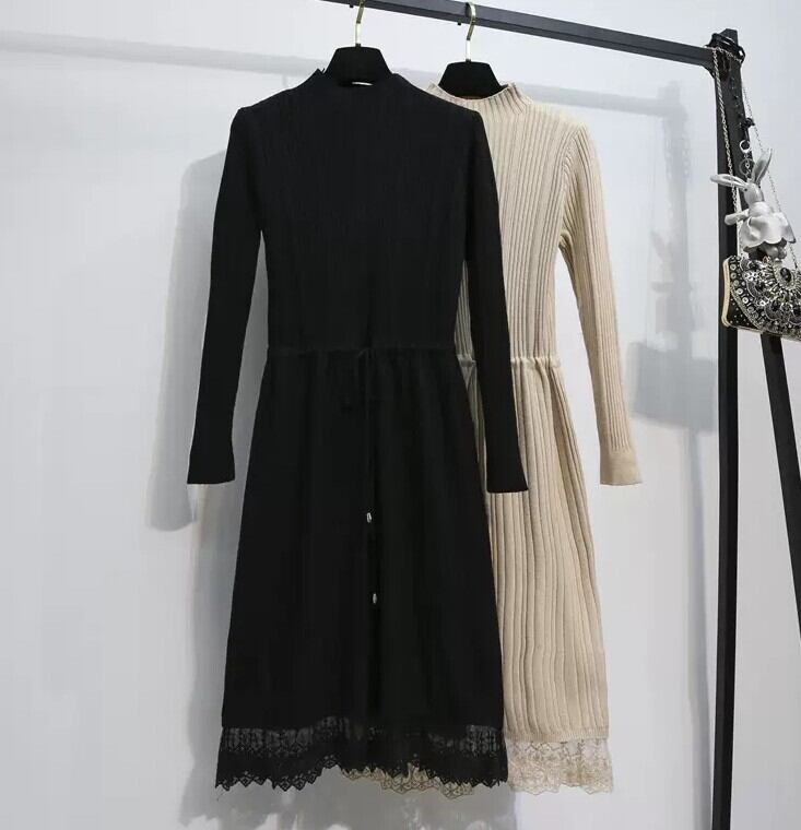 【送料無料】 ニット ワンピース ワンピ ロング丈 レース カジュアル シンプル 無地 春 秋 冬 トップス OP-001MK