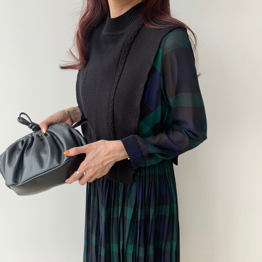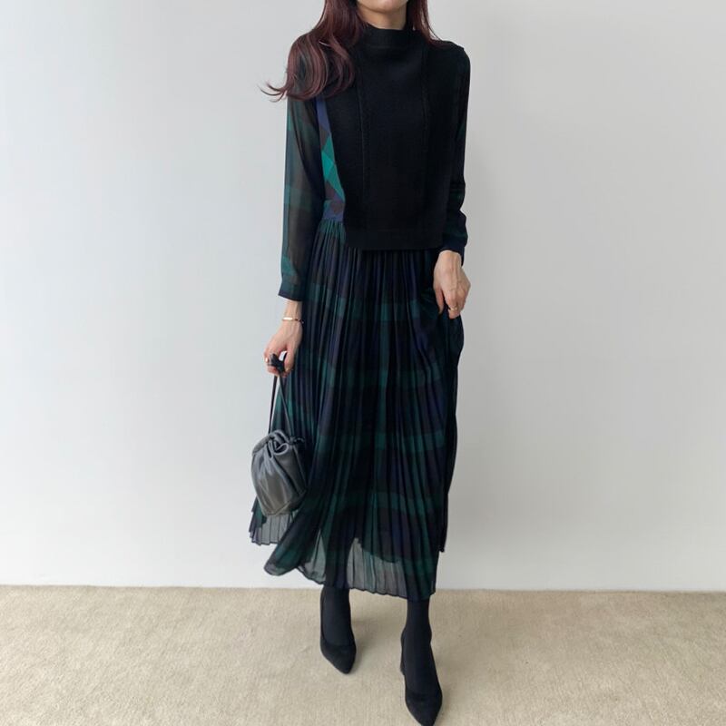 【送料無料】 ワンピース ドレス ニット セーター チェックスカート プリーツ ロング丈 女性らしい 大人可愛い キュート オシャレ カジュアル OP-009AU