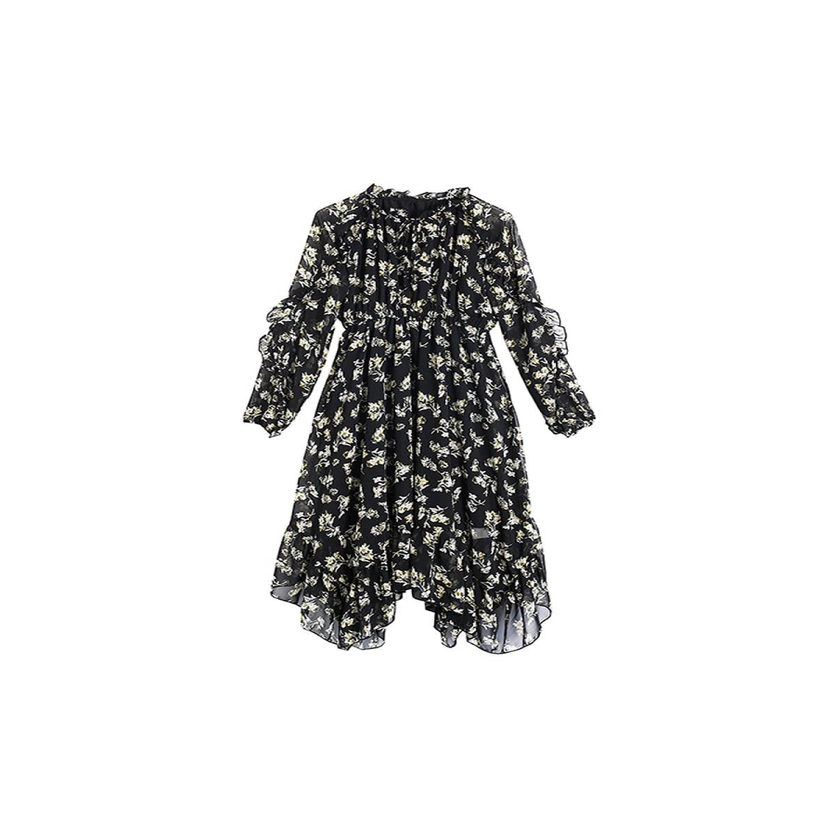 【送料無料】 レトロ 小花柄 フェミニン ワンピース ブラック モノトーン 春 秋 大人可愛い ゆったり ウエストゴム お出かけ デート 女子会 旅行 上品 フリル シースルー OP-016KR