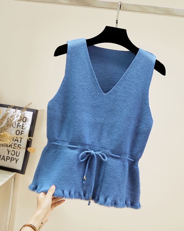 【送料無料】 トップス ブラウス ベスト ノースリーブ Vネック ウエストリボン シンプル カジュアル ニット 大人可愛い キュート オシャレ TP-003AU