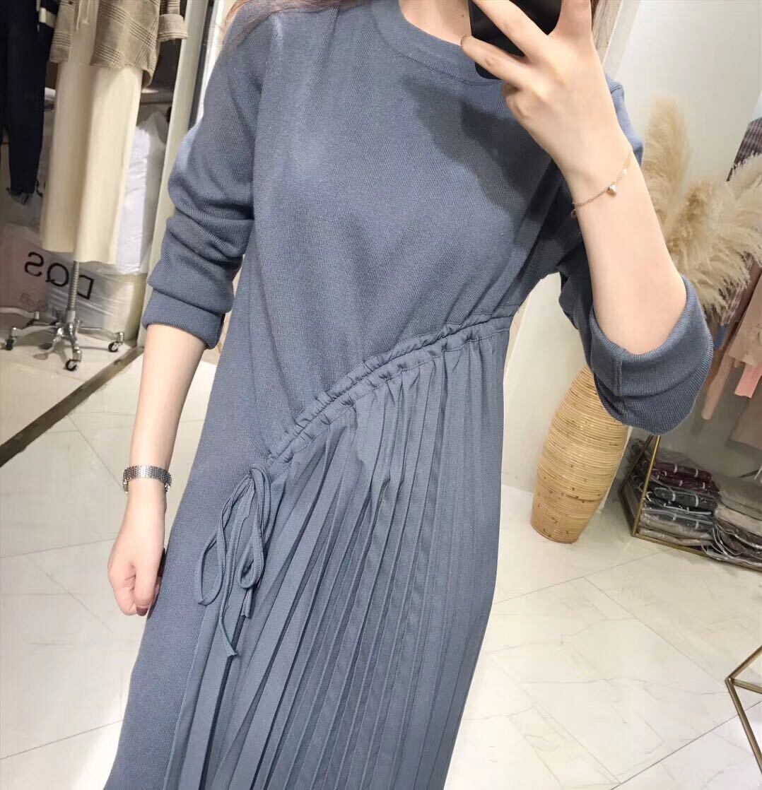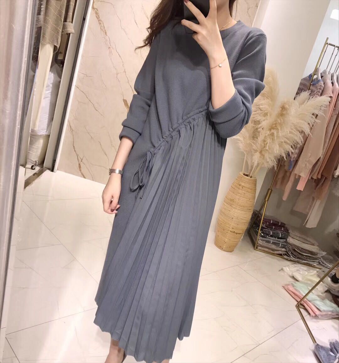 【送料無料】 ワンピース ドレス ニットワンピ 長袖 プリーツ ウエスト絞り ミモレ丈 ひざ下 大人可愛い キュート オシャレ カジュアル シンプル OP-010AU