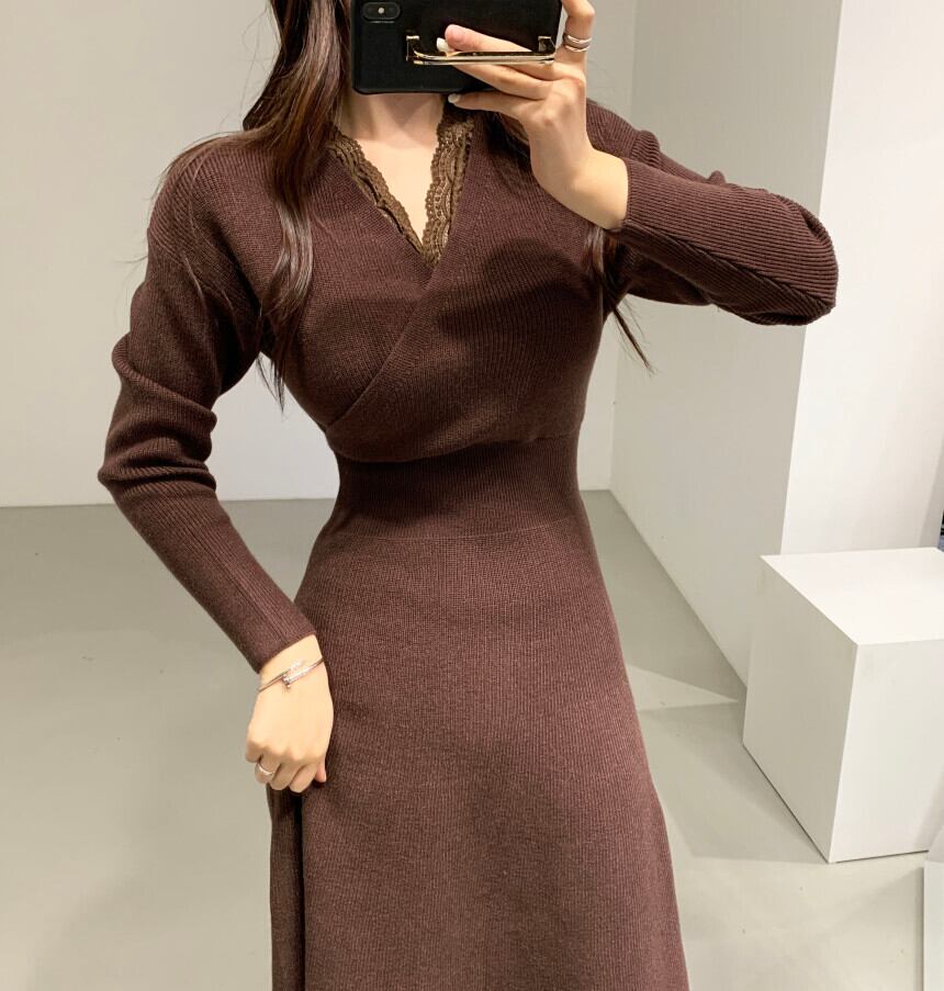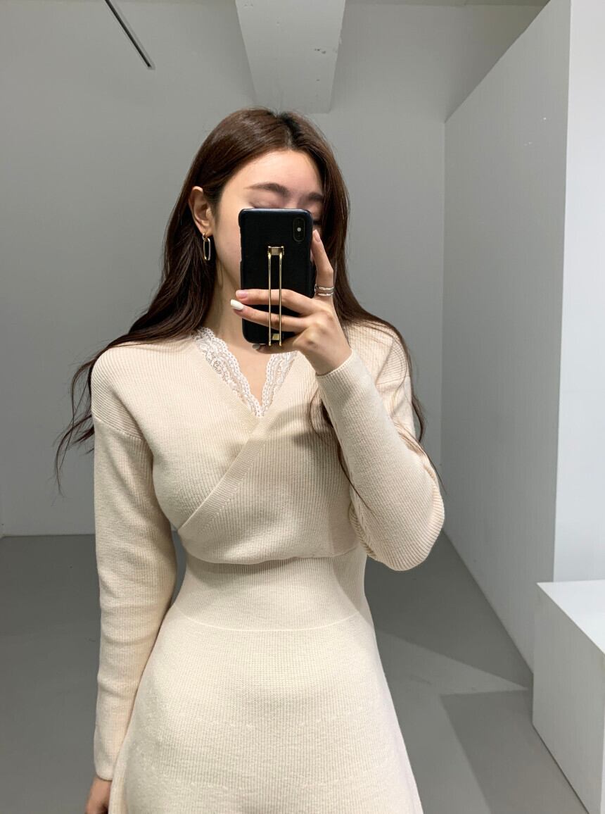 【送料無料】 ワンピース ドレス Vネック ラップフロント レース ウエストスリム 膝丈 カジュアル シンプル 長袖 秋冬 大人可愛い キュート オシャレ エレガント OP-011AU