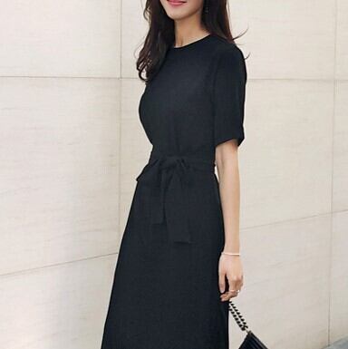 【送料無料】 ワンピース 膝丈 ブラック フォーマル シンプル ワンカラー 大人 きれいめ エレガント デート 女子会 入学式 入園式 オフィス 通勤 ラウンドネック ウエストリボン スリット 春夏 春服 OP-195KJ