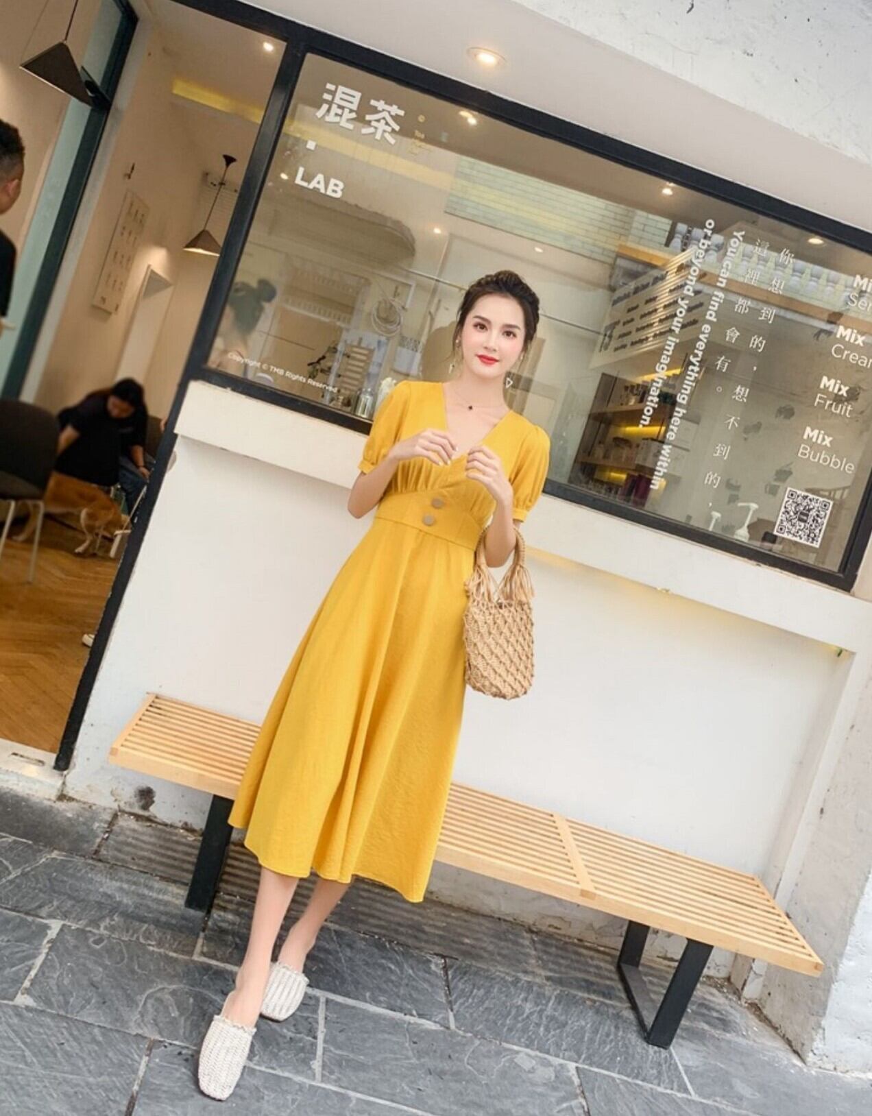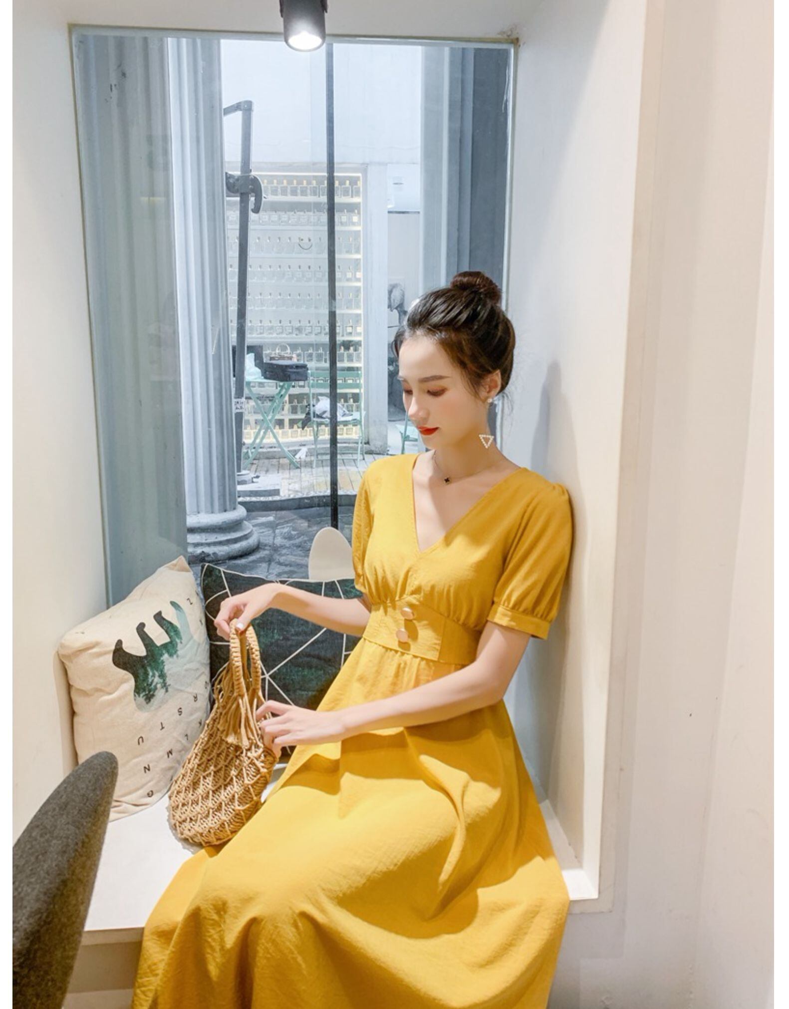 【送料無料】 ワンピース 春服 春夏 Vネック ボリューム袖 フレアスカート Aラインスカート きれいめ 膝丈 デート ハイウエスト 女子会 OP-205KJ