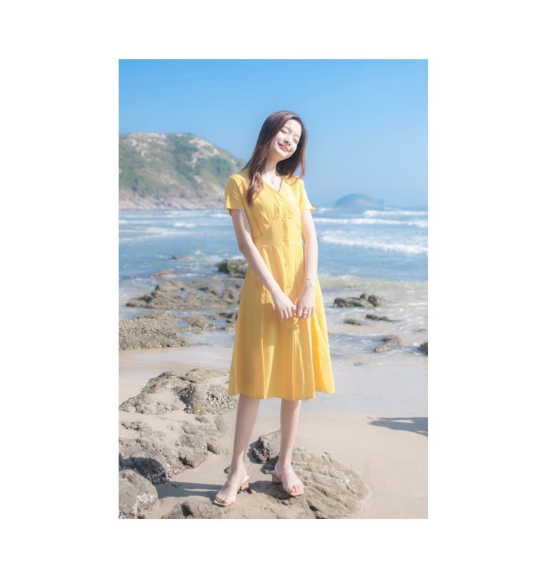 【送料無料】 ワンピース ロングワンピース 膝丈 イエロー 春服 春夏 Vネック フレアスカート きれいめ デート 女子会 OP-206KJ