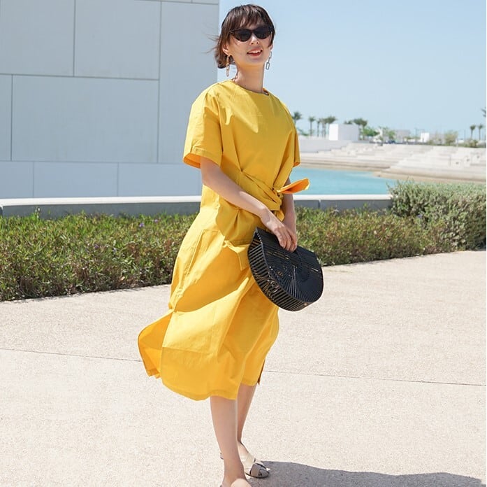 【送料無料】 ワンピース 春夏 イエロー ネイビー 春服 フレアスカート Aラインスカート ウエストリボン ゆったり 着痩せ 大人 きれいめ デート OP-208KJ